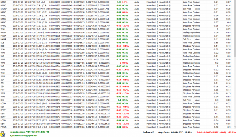 Ольга Сухачеванаписала20 июля 2018 в 19:24 Добрый вечер, Подскажите пож-та нужна помощь, запустила бота со всеми поправками, по отчету увидела, что сделки с валютой DENT закрываются в минус, Эту валюту добавила в стоп-лист, но бот по ней все равно продолжает совершать сделки. за сутки потеряла 22%. Подскажите, что не так? могу сделать скриншоты