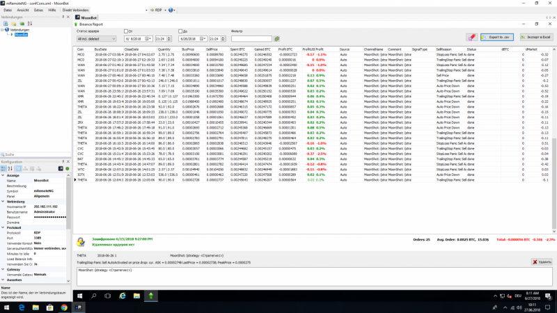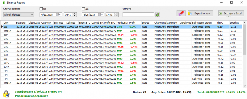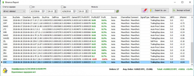 Результат за 17 часов работы бота на локальном компьютере.Интернет мобильный, пинг от 450 до 1000.