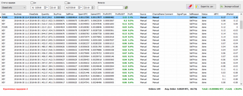 Михаил Кузякнаписал30 июня 2018 в 17:42На счет авто скальпинга, там есть особенность. Нужно следить что бы в монете был только рост, и только тогда можно пробовать авто скальпинг включить. Но это немного рискованно.