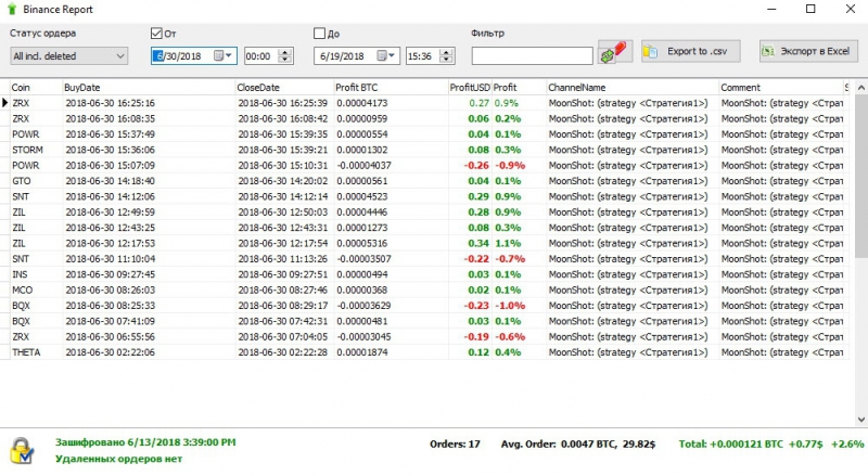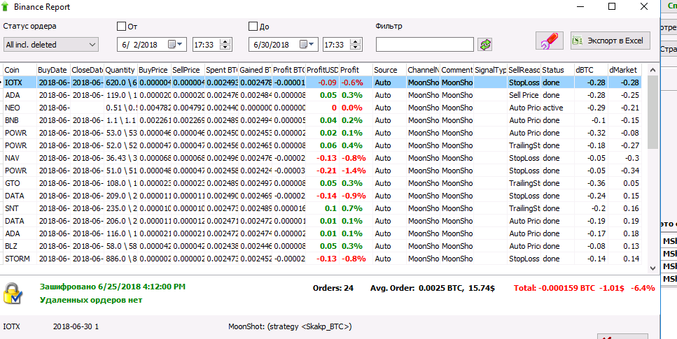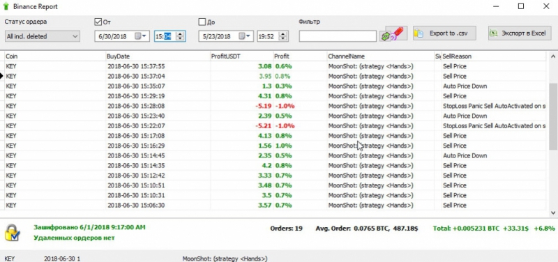 Идея в том. Что если есть монета, график которой подходит под наши параметры торговли. Мы настраиваем алгоритм мун шот, работать только по этой монете с минимальной дистанцией. В данном случае по монете KEY, средняя дистанция около 1%.