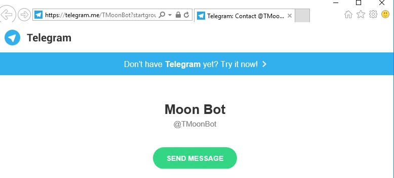 Добрый день, была в поездке, отстала от событий. Пыталась подключить Телеграм, но при нажатии Add @MoonBot to your channel, не выходит вверху окошко Open telegram Desktop? А входит следующее...(скрин)