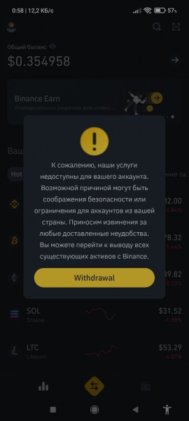 Причём тут переход по ссылке на сайт бинанса? Перейти и я мог всегда и сейчас могу тоже. Но после авторизации в своём аккаунте — после ввода логина/пароля/2FA и т.п., сразу же всплывает окно, которое я показал на скриншоте в своём предыдущем сообщении. То есть в аккаунт я попасть могу, но доступен только вывод средств.