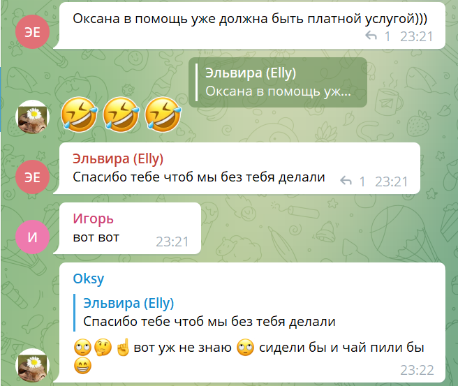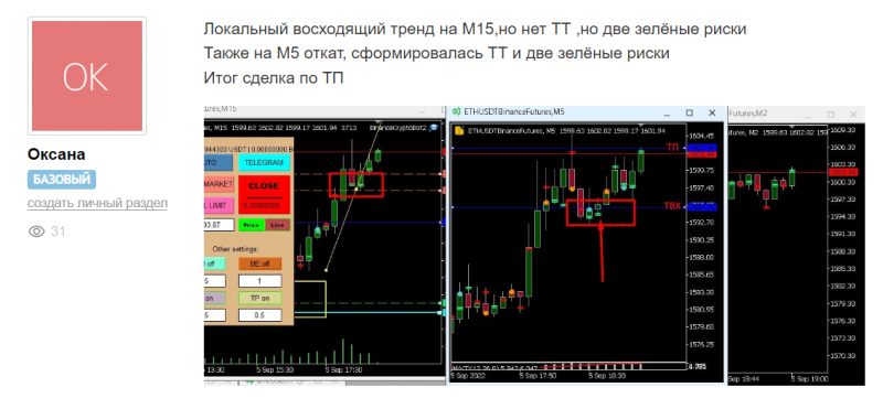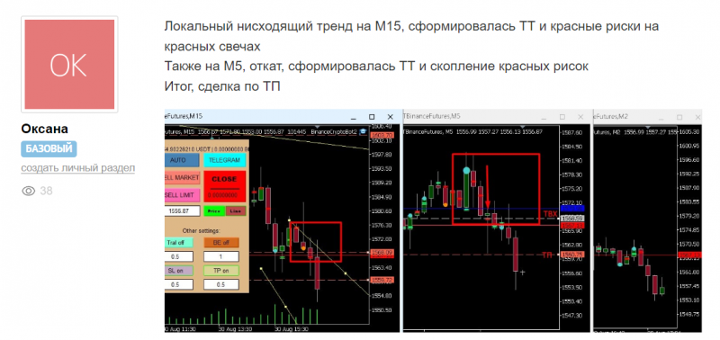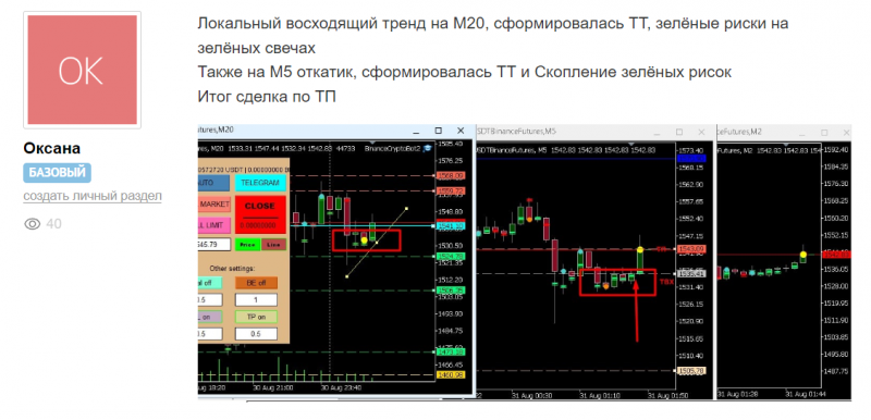 Также у нас есть группа, где все общаются, разбираем точки входа. Смотрим, кто и что видит, стоит ли входить в сделку и почему, друг другу помогаем разобраться, в чате у нас веселая атмосфера, бывает и шутим.