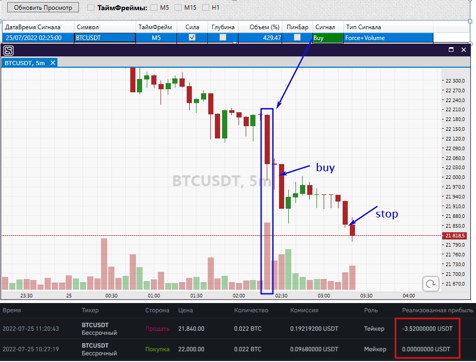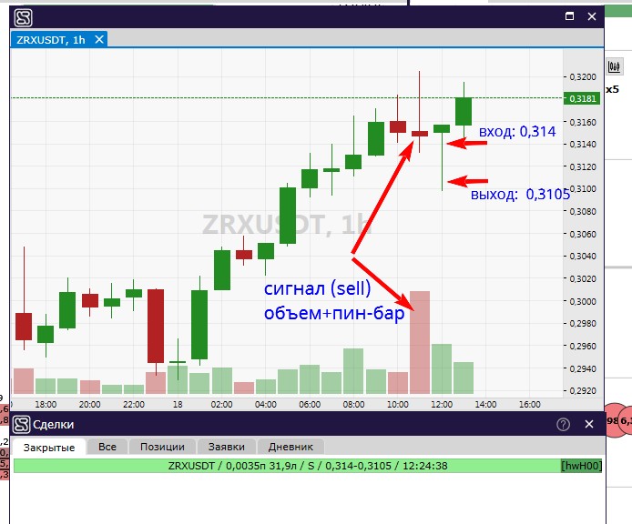 Первая минусовая сделка по ZILUSDT. Сигнал из варианта с пин-баром, поэтому входил чуть ниже сигнальной свечи, а на следующей свече закрылся по стопу: