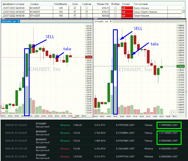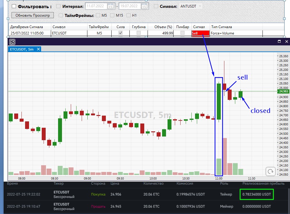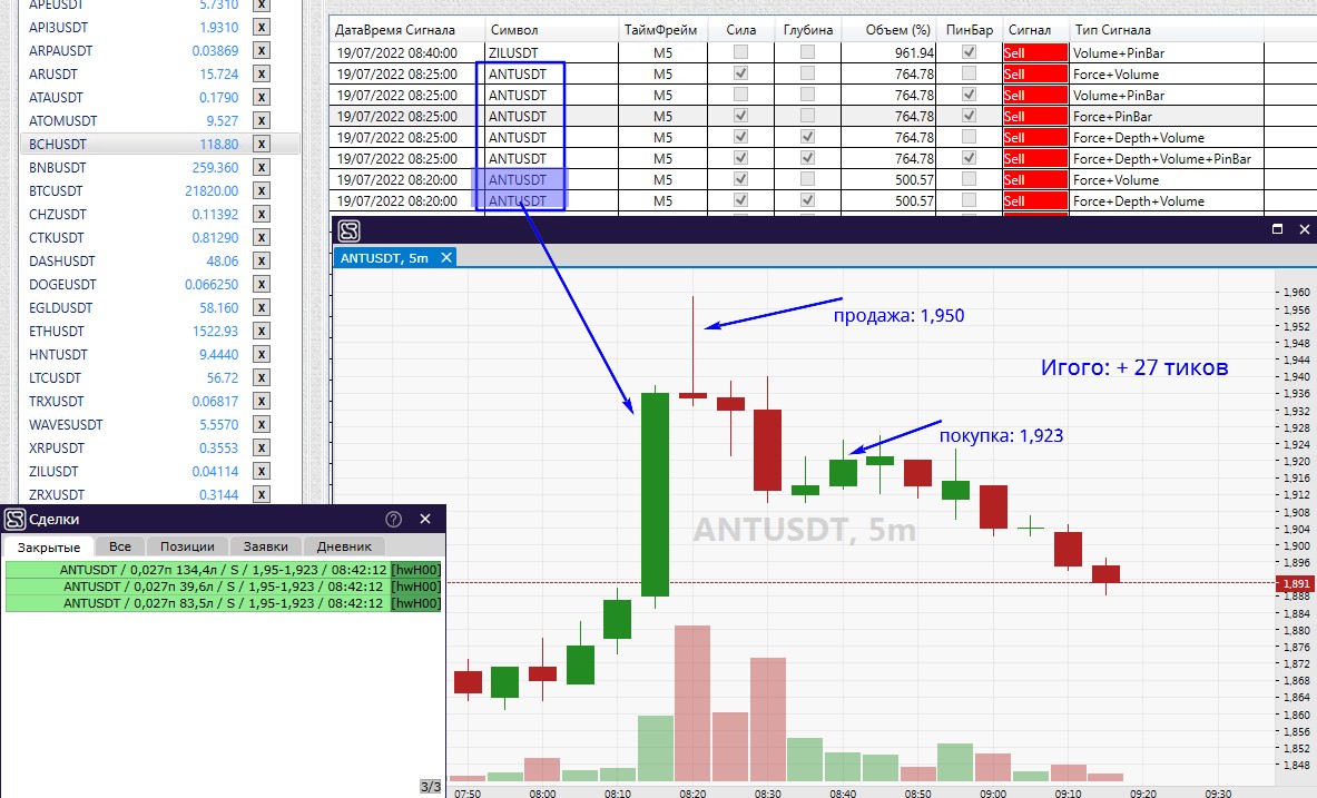 ANT, 2 сигнала на продажу на М5, затем еще 2 на М15, получилось забрать +1,13%