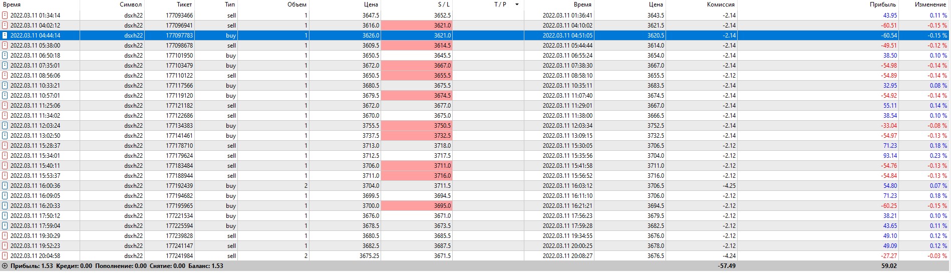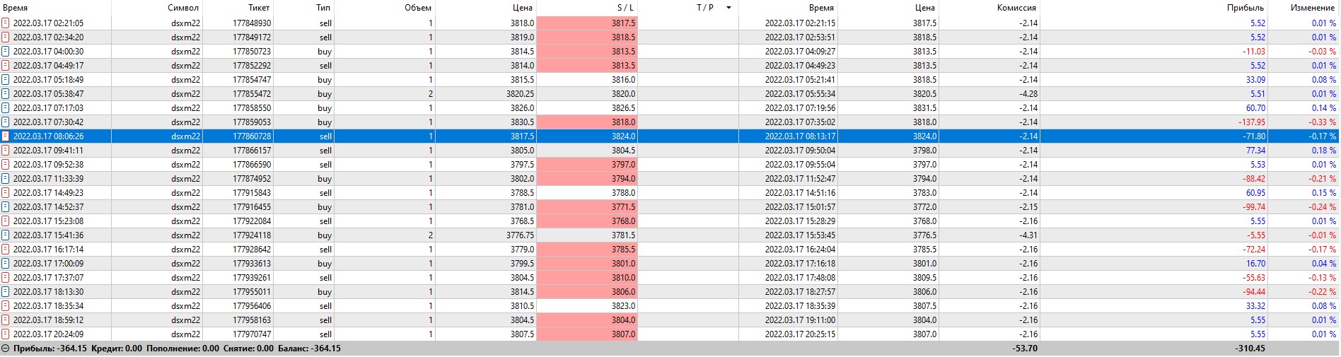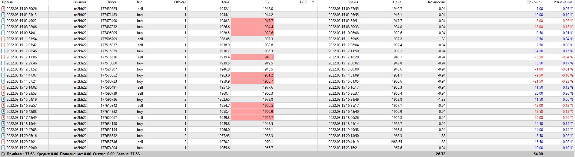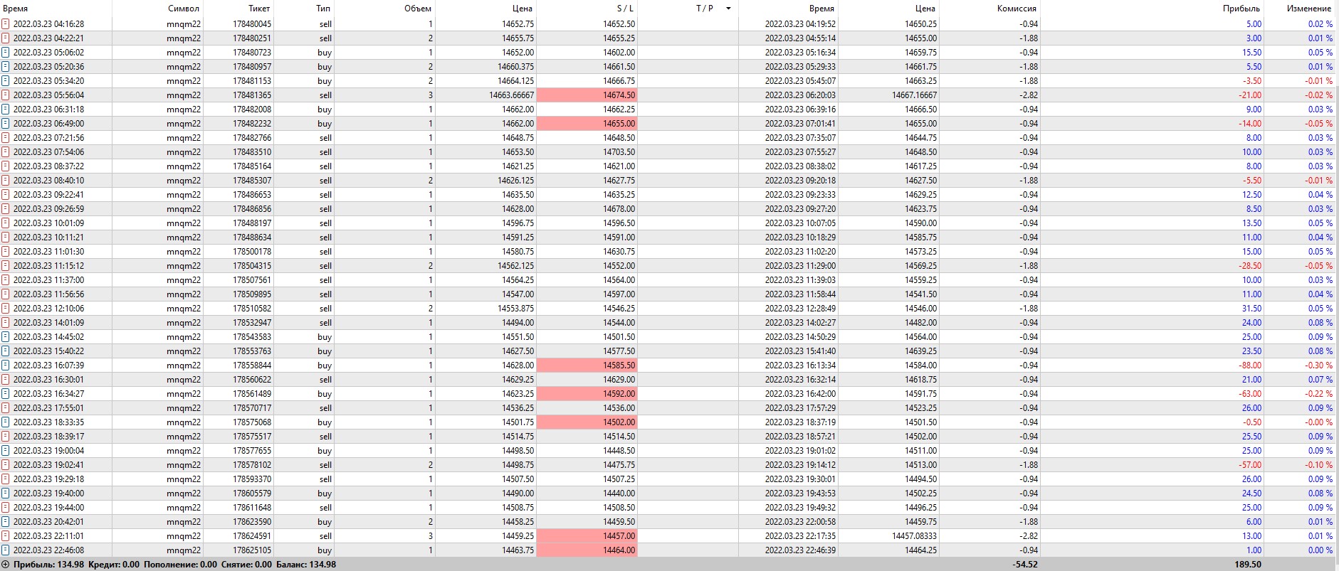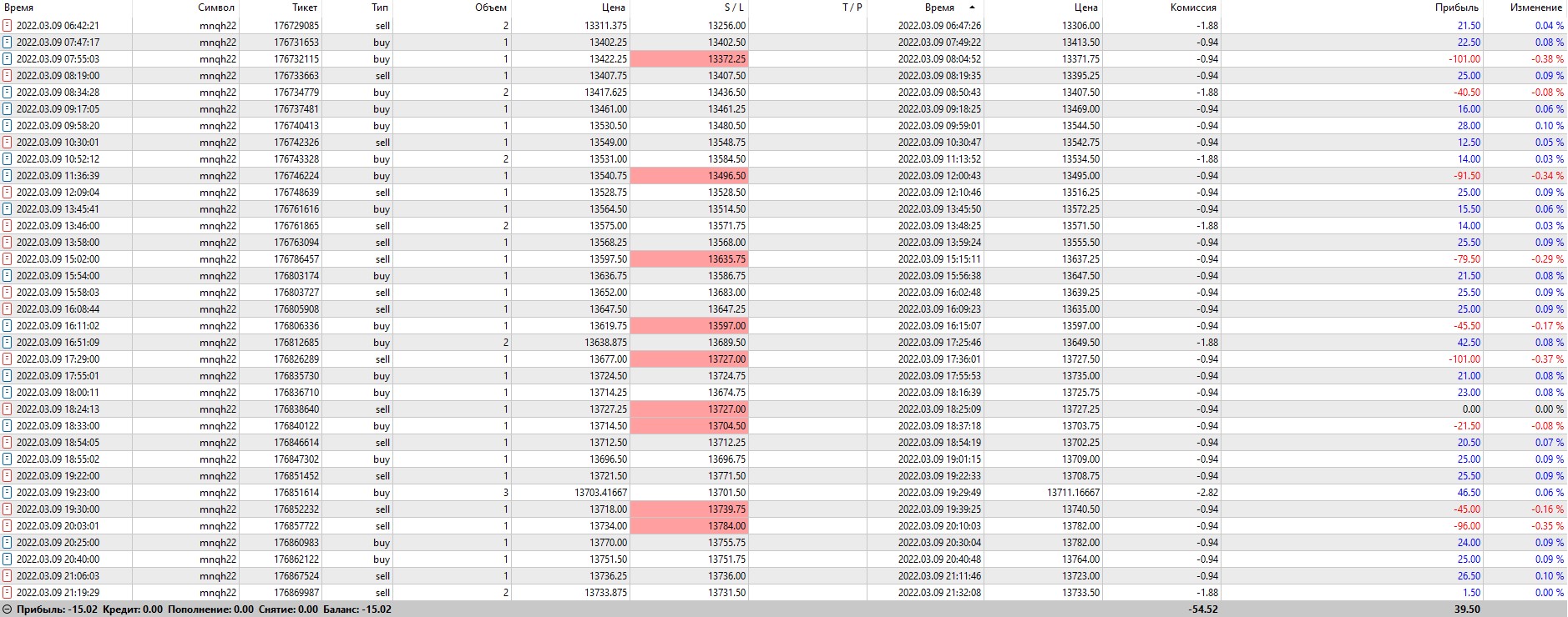 За 15.03.22. получился общий плюс 324,35$. СП500 получил минус -51,34$. Наздак получил плюс 109,26$. Доу Джонс получил минус -25,04$. Рассел получил плюс 37,68$. Евро Стокс получил плюс 253,79$. Бот стоит на ВПН на демо счёте. Включены все кнопки. Торгует одновременно 1 контрактом на микро инструментах: СП500, Наздак, Доу Джонс, Рассел и мини Евро Стокс. Настройки стандартные с включёнными фракталом и безубытком. Торгую с 00,30ч. до 13,00ч. и с 14,00ч. до 23,30ч. в пятницу до 20,30ч. Евро Стокс торгую с 01,00ч. до 13,00ч. и с 14,00ч. до 20,30ч. по времени терминала.