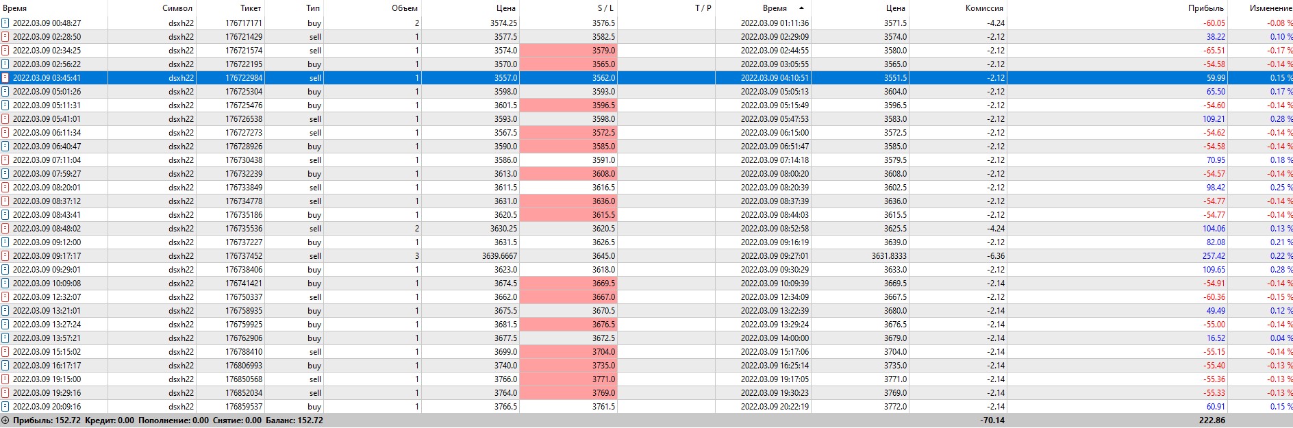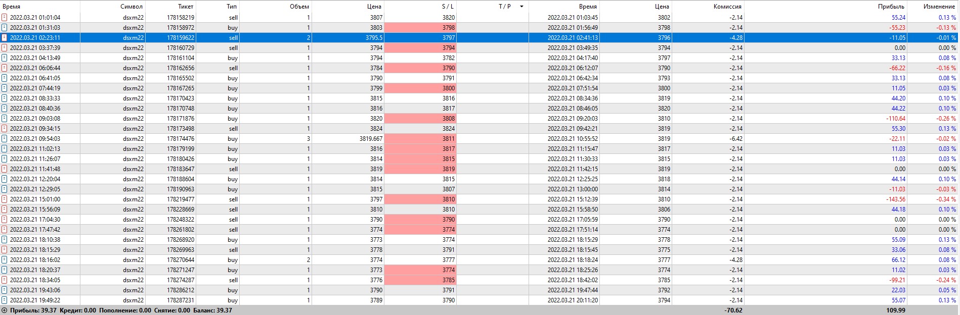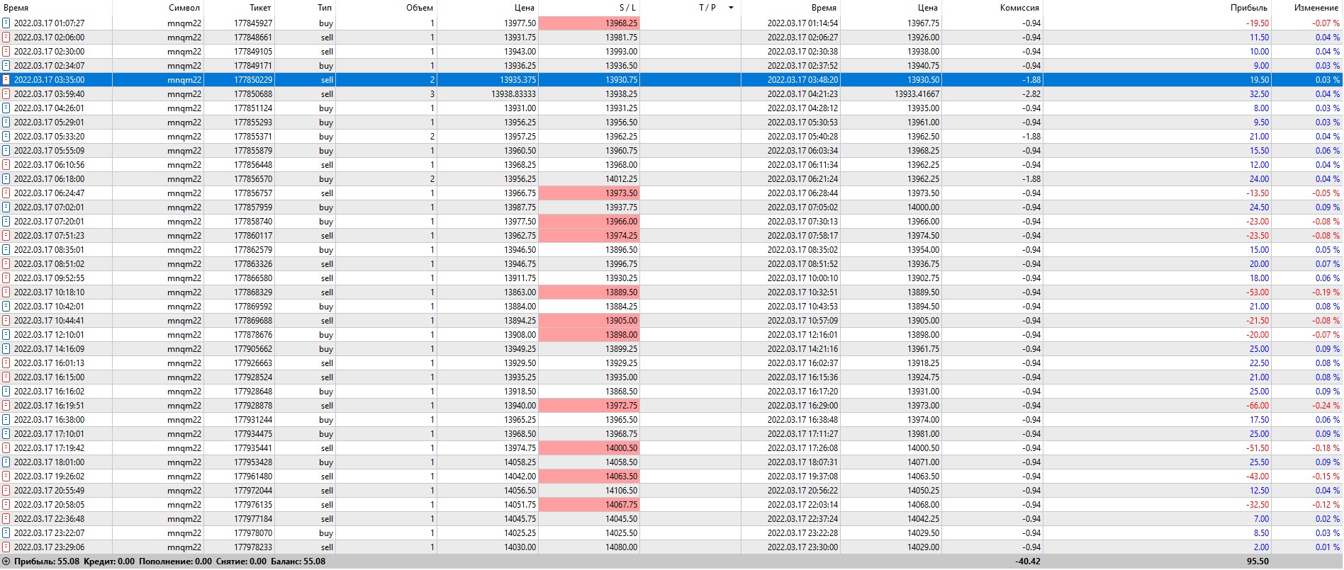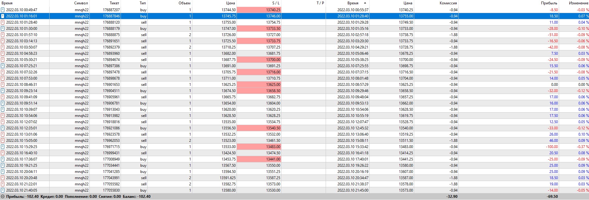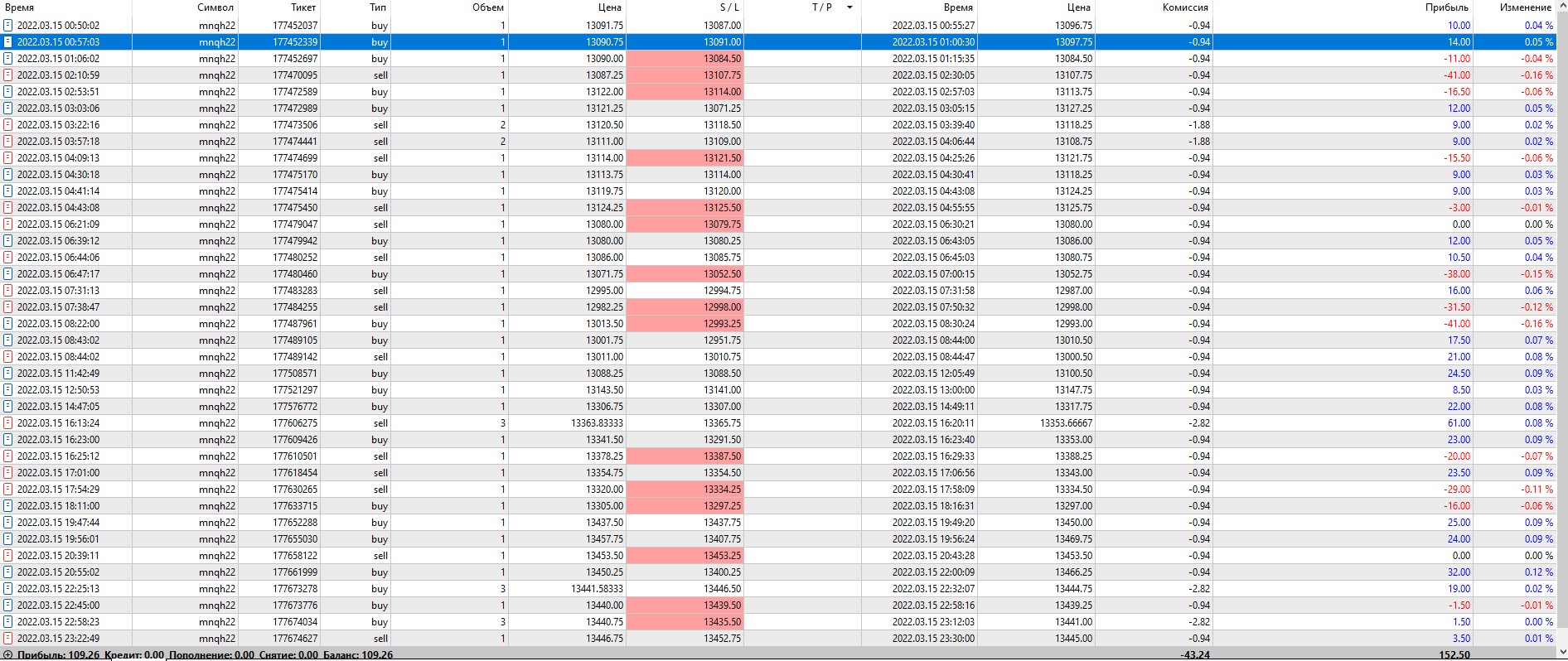 За 15.03.22. получился общий плюс 324,35$. СП500 получил минус -51,34$. Наздак получил плюс 109,26$. Доу Джонс получил минус -25,04$. Рассел получил плюс 37,68$. Евро Стокс получил плюс 253,79$. Бот стоит на ВПН на демо счёте. Включены все кнопки. Торгует одновременно 1 контрактом на микро инструментах: СП500, Наздак, Доу Джонс, Рассел и мини Евро Стокс. Настройки стандартные с включёнными фракталом и безубытком. Торгую с 00,30ч. до 13,00ч. и с 14,00ч. до 23,30ч. в пятницу до 20,30ч. Евро Стокс торгую с 01,00ч. до 13,00ч. и с 14,00ч. до 20,30ч. по времени терминала.