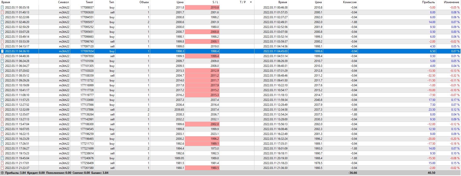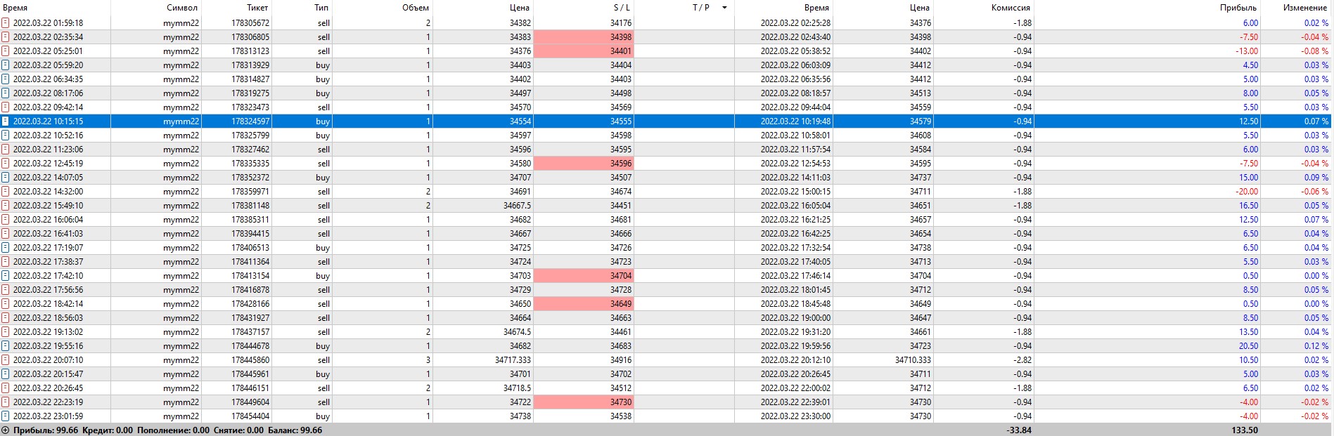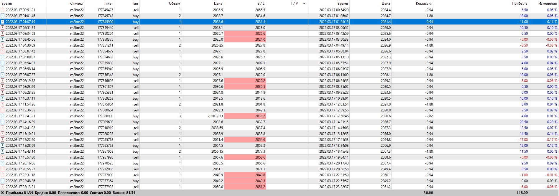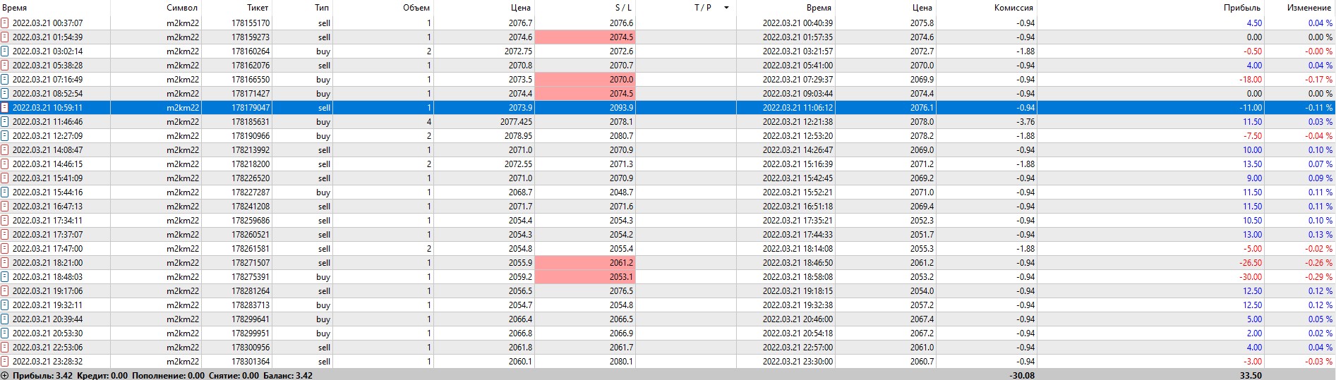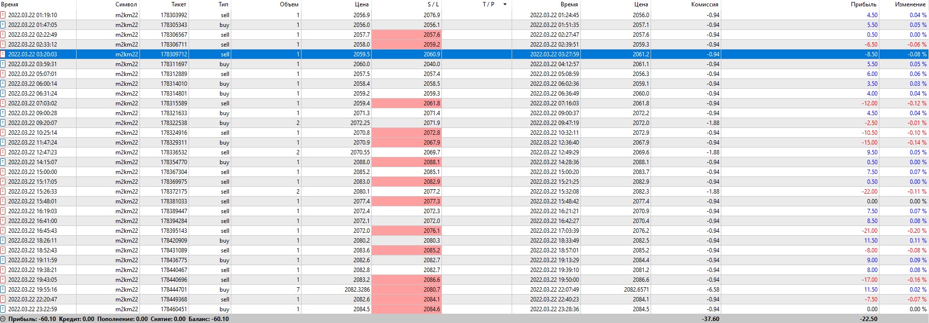 За 15.03.22. получился общий плюс 324,35$. СП500 получил минус -51,34$. Наздак получил плюс 109,26$. Доу Джонс получил минус -25,04$. Рассел получил плюс 37,68$. Евро Стокс получил плюс 253,79$. Бот стоит на ВПН на демо счёте. Включены все кнопки. Торгует одновременно 1 контрактом на микро инструментах: СП500, Наздак, Доу Джонс, Рассел и мини Евро Стокс. Настройки стандартные с включёнными фракталом и безубытком. Торгую с 00,30ч. до 13,00ч. и с 14,00ч. до 23,30ч. в пятницу до 20,30ч. Евро Стокс торгую с 01,00ч. до 13,00ч. и с 14,00ч. до 20,30ч. по времени терминала.