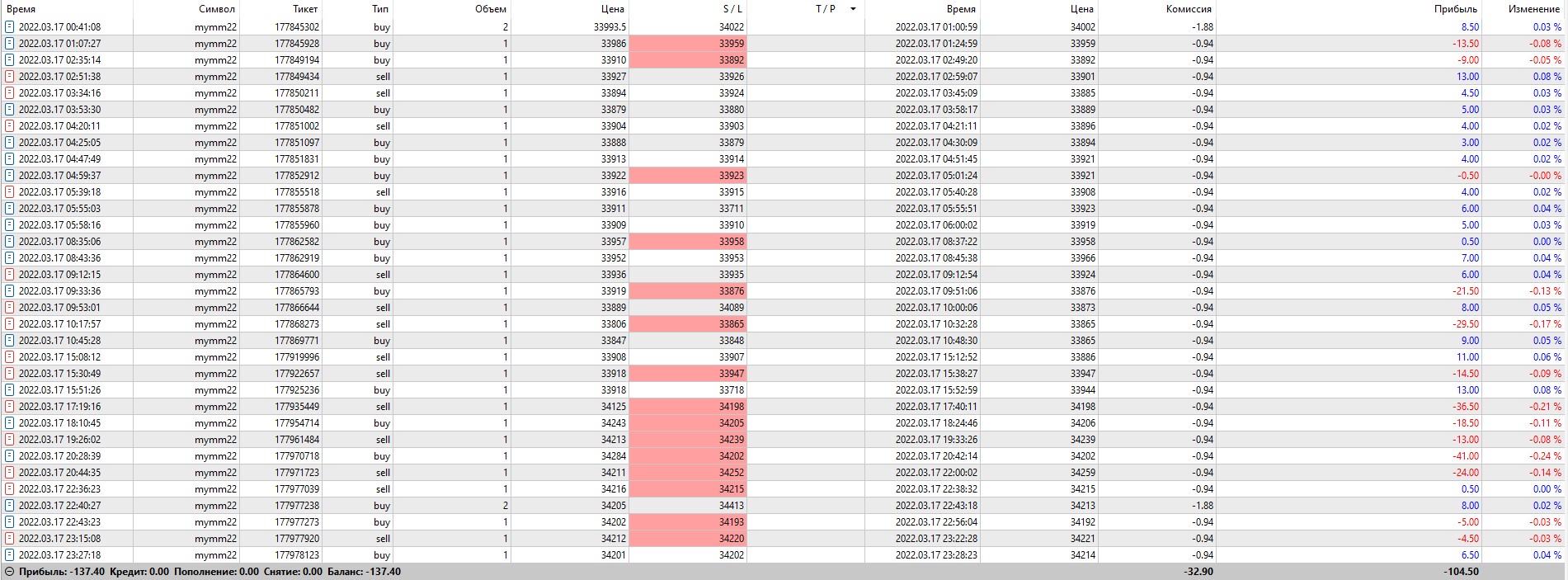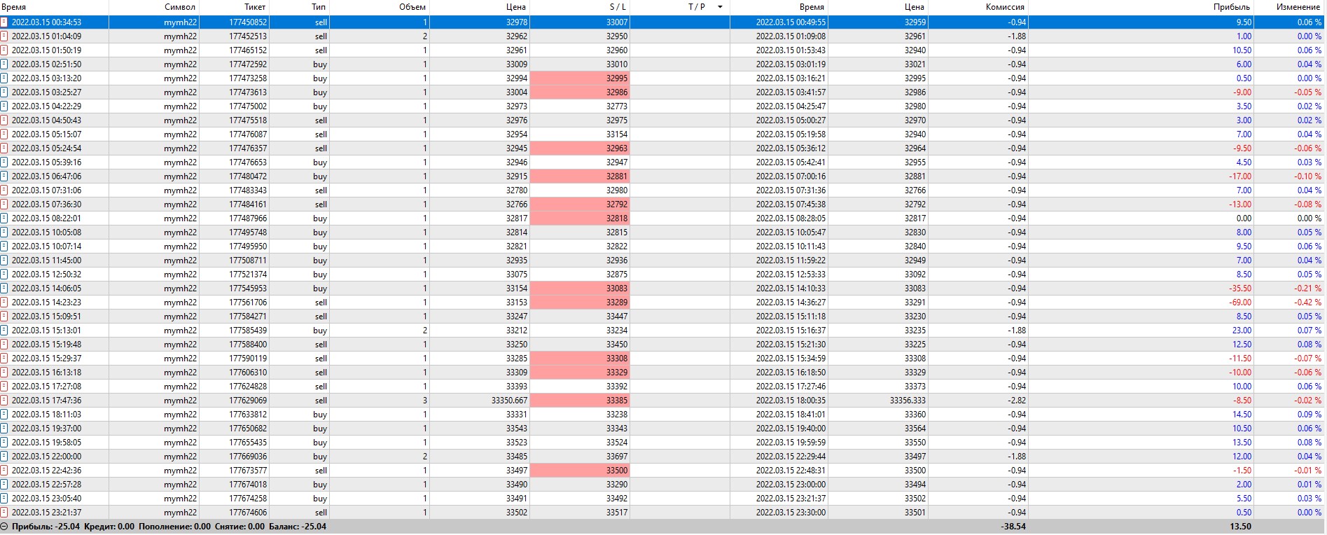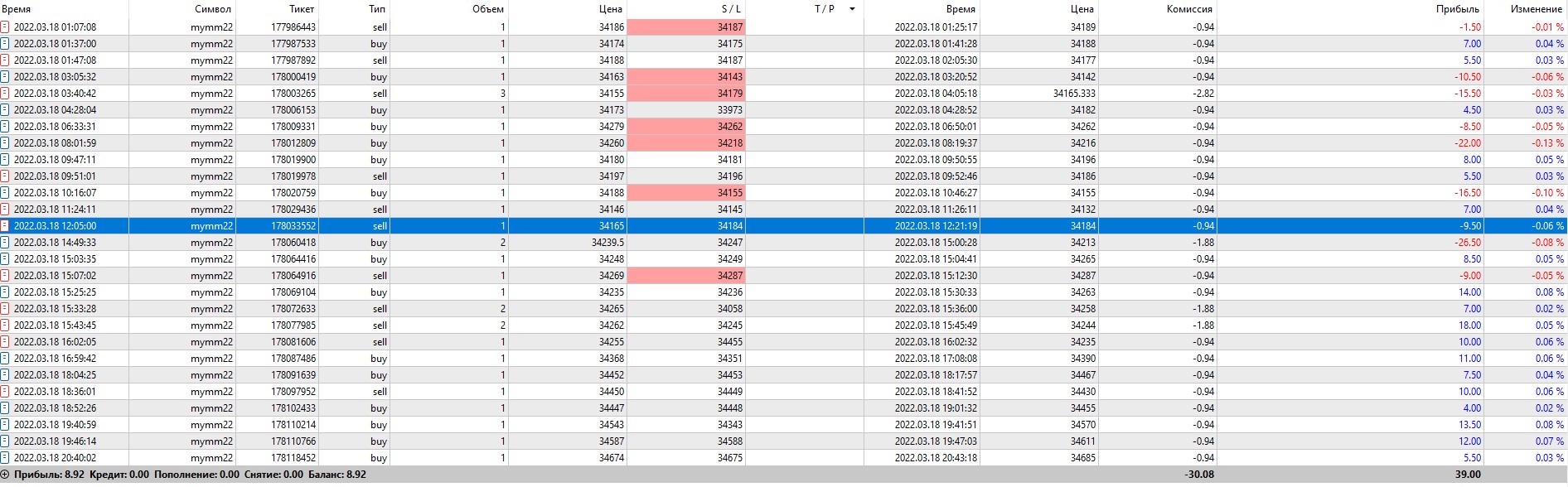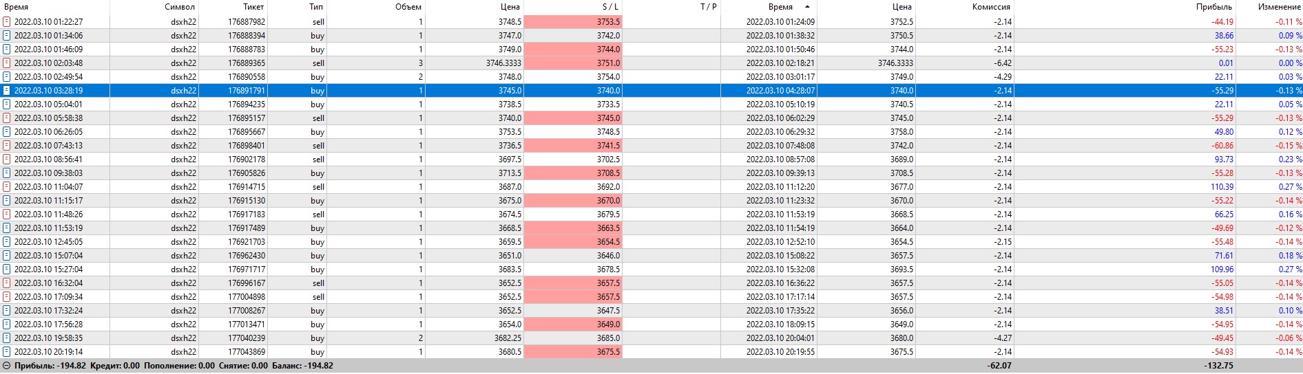 За 10.03.22. получился общий минус -348,56$. СП500 получил плюс 78,98$. Наздак получил минус -102,4$. Доу Джонс получил плюс 48,9$. Рассел получил минус -179,22$. Евро Стокс получил минус -194,82$. Бот стоит на ВПН на демо счёте. Включены все кнопки. Торгует на микро инструментах: СП500, Наздак, Доу Джонс, Рассел и мини Евро Стокс. Настройки стандартные с включёнными фракталом и безубытком. Только на Евро Стокс выключен фрактал и стоп стоит 10, тейк 20. Торгую с 00,30ч. до 14,00ч. и с 15,00ч. до 21,45ч., Евро Стокс торгую с 01,00ч. до 14,00ч. и с 15,00ч. до 20,30ч. по времени терминала.