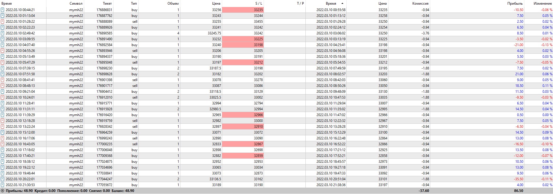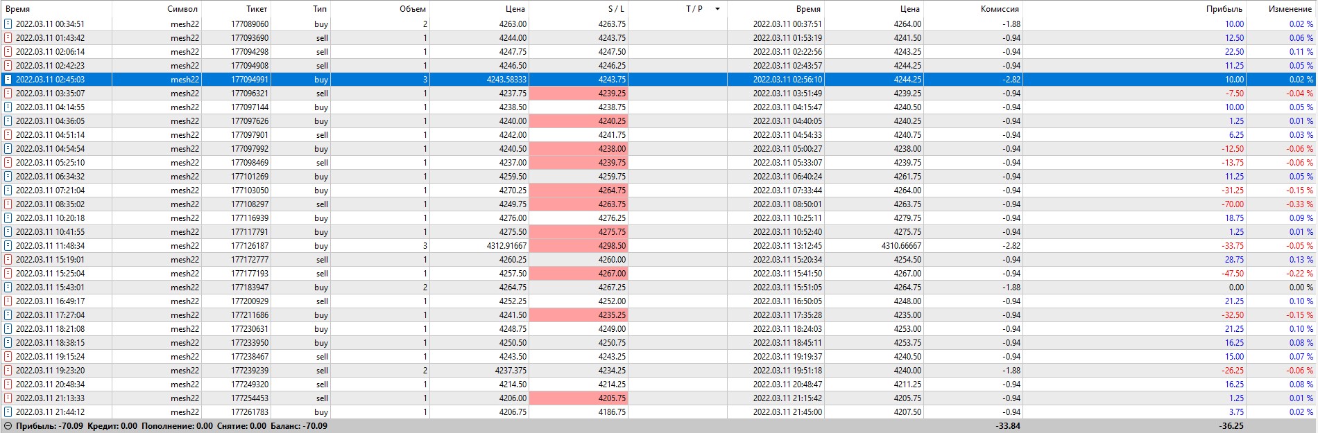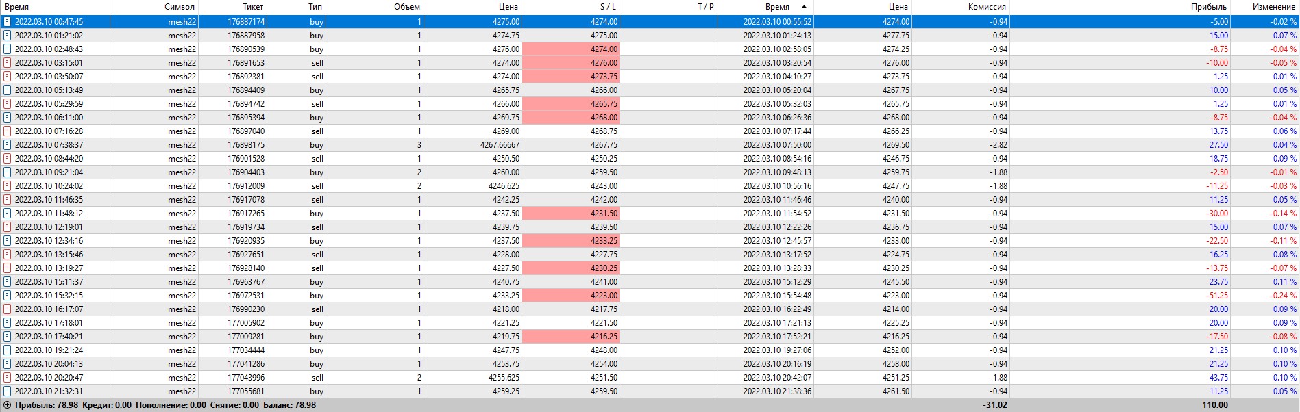 За 10.03.22. получился общий минус -348,56$. СП500 получил плюс 78,98$. Наздак получил минус -102,4$. Доу Джонс получил плюс 48,9$. Рассел получил минус -179,22$. Евро Стокс получил минус -194,82$. Бот стоит на ВПН на демо счёте. Включены все кнопки. Торгует на микро инструментах: СП500, Наздак, Доу Джонс, Рассел и мини Евро Стокс. Настройки стандартные с включёнными фракталом и безубытком. Только на Евро Стокс выключен фрактал и стоп стоит 10, тейк 20. Торгую с 00,30ч. до 14,00ч. и с 15,00ч. до 21,45ч., Евро Стокс торгую с 01,00ч. до 14,00ч. и с 15,00ч. до 20,30ч. по времени терминала.