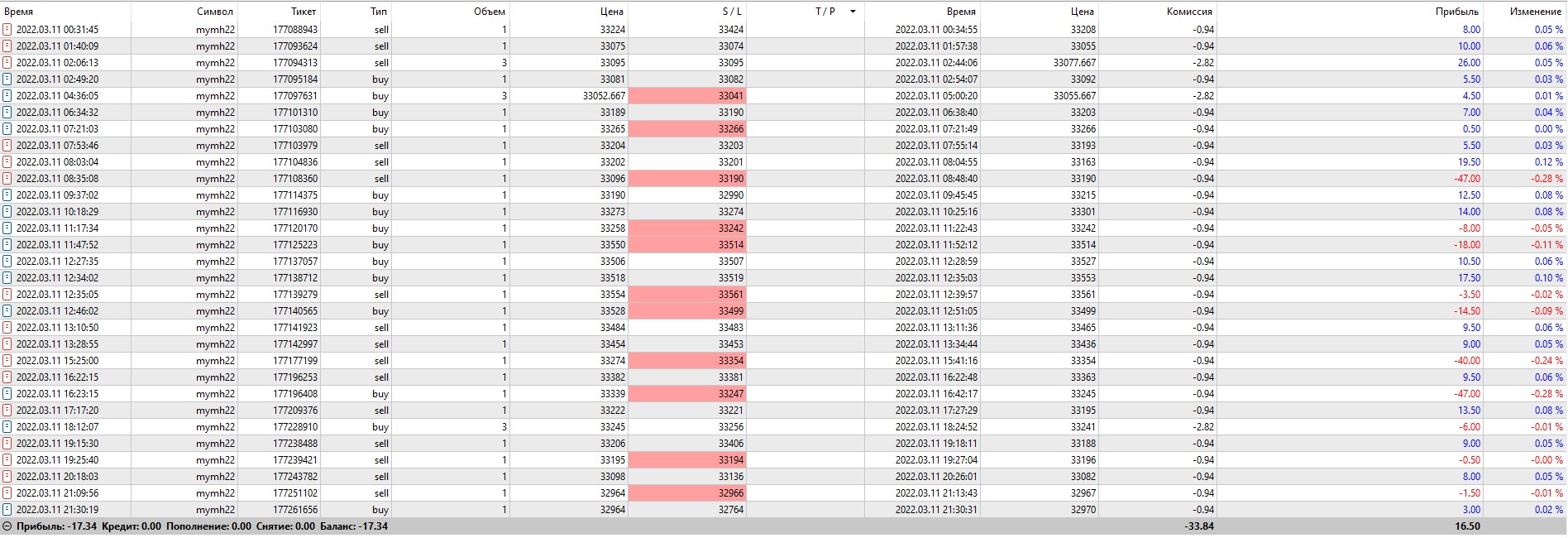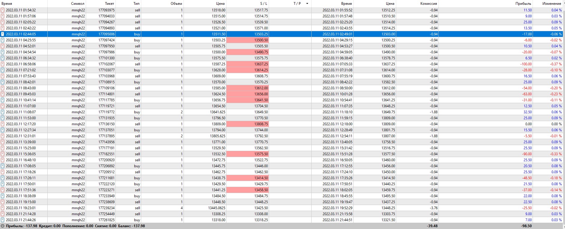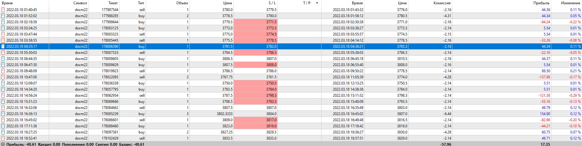 За 17.03.22. получился общий минус -566,46$. СП500 получил минус -201,33$. Наздак получил плюс 55,08$. Доу Джонс получил минус -137,4$. Рассел получил плюс 81,34$. Евро Стокс получил минус -364,15$. Бот стоит на ВПН на демо счёте. Включены все кнопки. Торгует одновременно 1 контрактом на микро инструментах: СП500, Наздак, Доу Джонс, Рассел и мини Евро Стокс. Настройки стандартные с включёнными фракталом и безубытком. Торгует с 00,30ч. до 13,00ч. и с 14,00ч. до 23,30ч. в пятницу до 20,30ч. Евро Стокс торгую с 01,00ч. до 13,00ч. и с 14,00ч. до 20,30ч. по времени терминала.