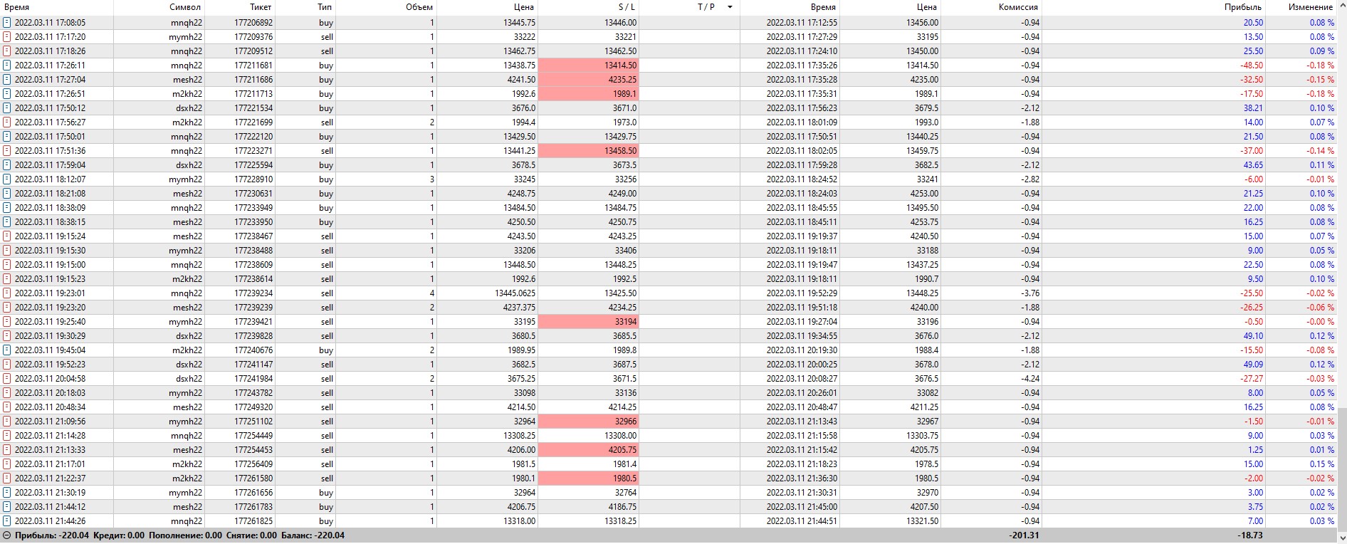 За 18.03.22. получился общий минус -32,43$. СП500 получил плюс 8,98$. Наздак получил минус -46,38$. Доу Джонс получил плюс 8,92$. Рассел получил плюс 36,66$. Евро Стокс получил минус -40,61$. За неделю получился общий минус -1291,69$. СП500 получил минус -98,28$, Наздак получил плюс 81,72$, Доу Джонс получил минус -128,12$, Рассел получил плюс 143,31$, Евро Стокс получил минус -1290,31$. Бот стоит на ВПН на демо счёте. Включены все кнопки. Торгует одновременно 1 контрактом на микро инструментах: СП500, Наздак, Доу Джонс, Рассел и мини Евро Стокс. Настройки стандартные с включёнными фракталом и безубытком. Торгует с 00,30ч. до 13,00ч. и с 14,00ч. до 23,30ч. в пятницу до 20,30ч. Евро Стокс торгую с 01,00ч. до 13,00ч. и с 14,00ч. до 20,30ч. по времени терминала.