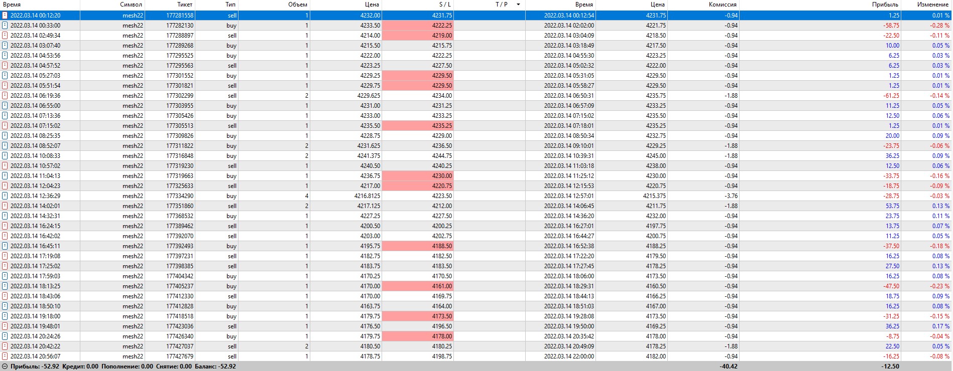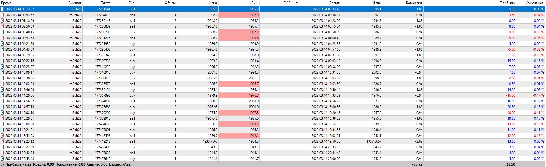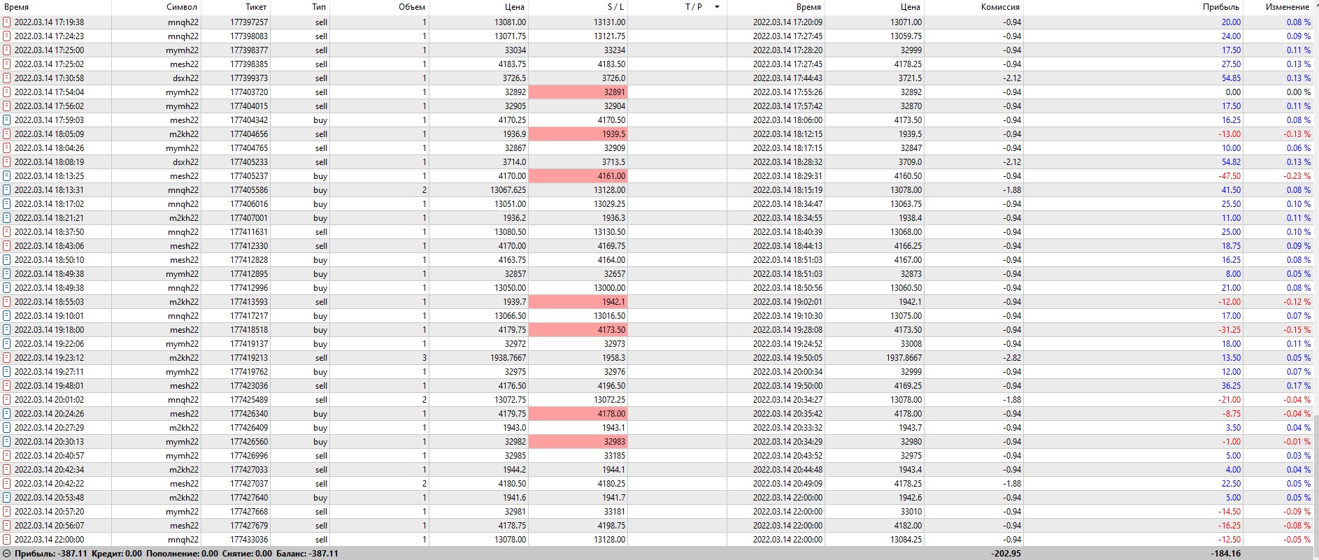 За 14.03.22. получился общий минус -387,11$. СП500 получил минус -52,92$. Наздак получил минус -93,4$. Доу Джонс получил минус -24,66$. Рассел получил минус -7,22$. Евро Стокс получил минус -208,91$. Бот стоит на ВПН на демо счёте. Включены все кнопки. Торгует на микро инструментах: СП500, Наздак, Доу Джонс, Рассел и мини Евро Стокс. Настройки стандартные с включёнными фракталом и безубытком. Торгую с 00,30ч. до 13,00ч. и с 14,00ч. до 23,30ч. в пятницу до 20,30ч. Евро Стокс торгую с 01,00ч. до 13,00ч. и с 14,00ч. до 20,30ч. по времени терминала.