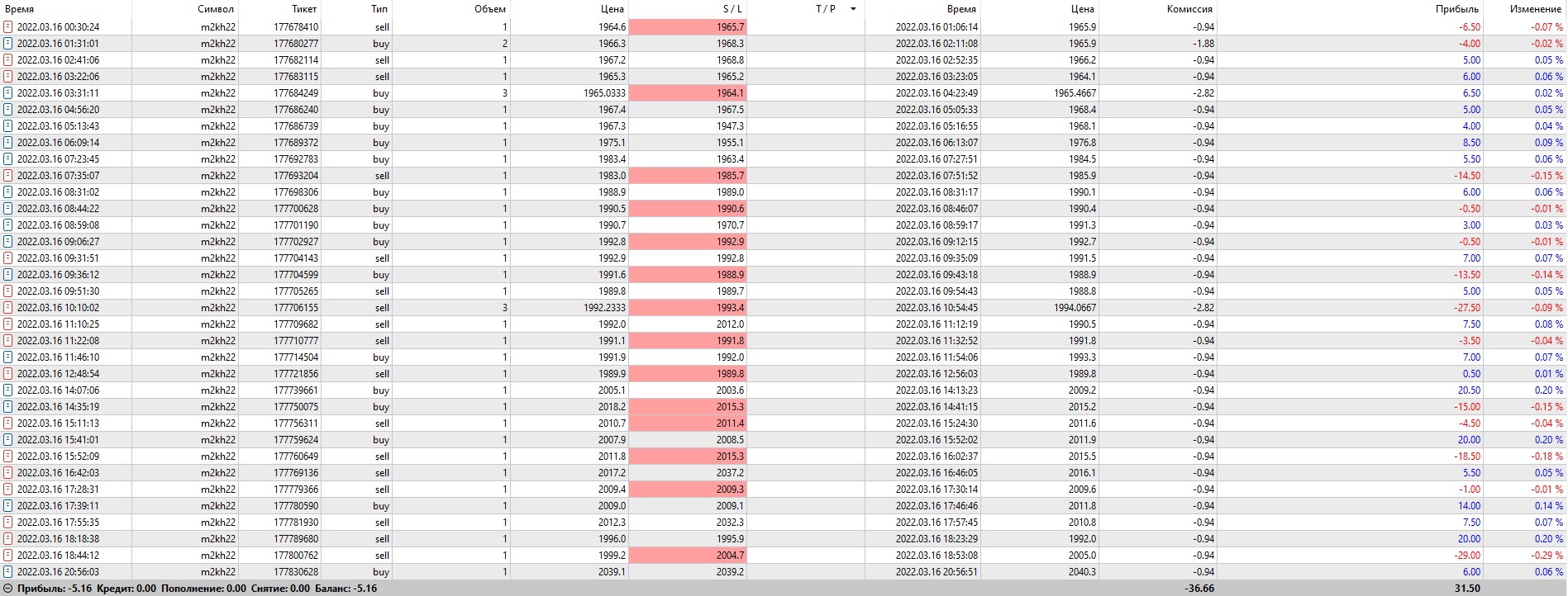 За 16.03.22. получился общий минус -630,04$. СП500 получил плюс 198,33$. Наздак получил плюс 57,16$. Доу Джонс получил плюс 50,06$. Рассел получил минус -5,16$. Евро Стокс получил минус -930,43$. Бот стоит на ВПН на демо счёте. Включены все кнопки. Торгует одновременно 1 контрактом на микро инструментах: СП500, Наздак, Доу Джонс, Рассел и мини Евро Стокс. Настройки стандартные с включёнными фракталом и безубытком. Торгую с 00,30ч. до 13,00ч. и с 14,00ч. до 23,30ч. в пятницу до 20,30ч. Евро Стокс торгую с 01,00ч. до 13,00ч. и с 14,00ч. до 20,30ч. по времени терминала. На Евро Стокс с начала недели сделал стоп 25, был 10, и включил фрактал, что-то получил по нему большой минус, но посмотрю дальше, что с ним делать.