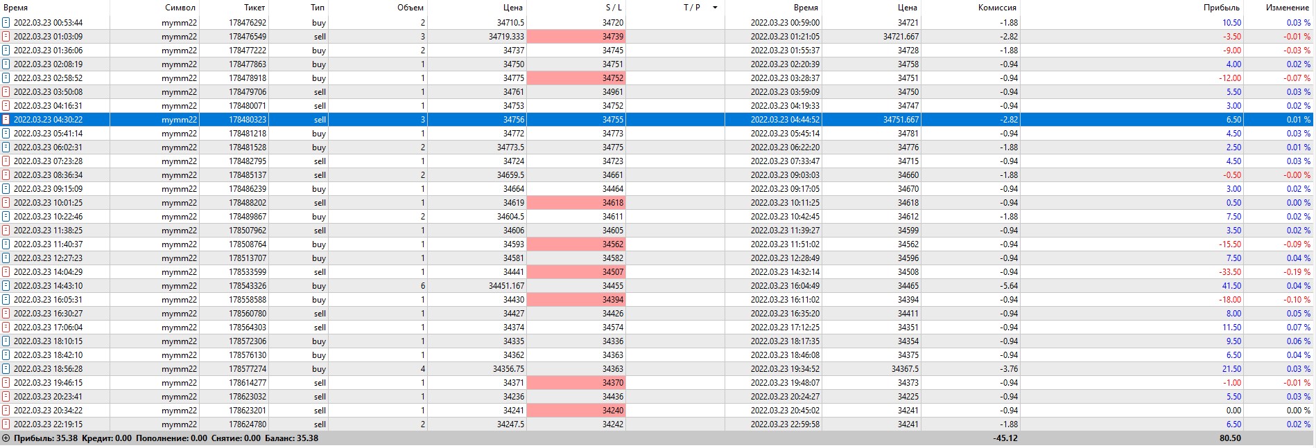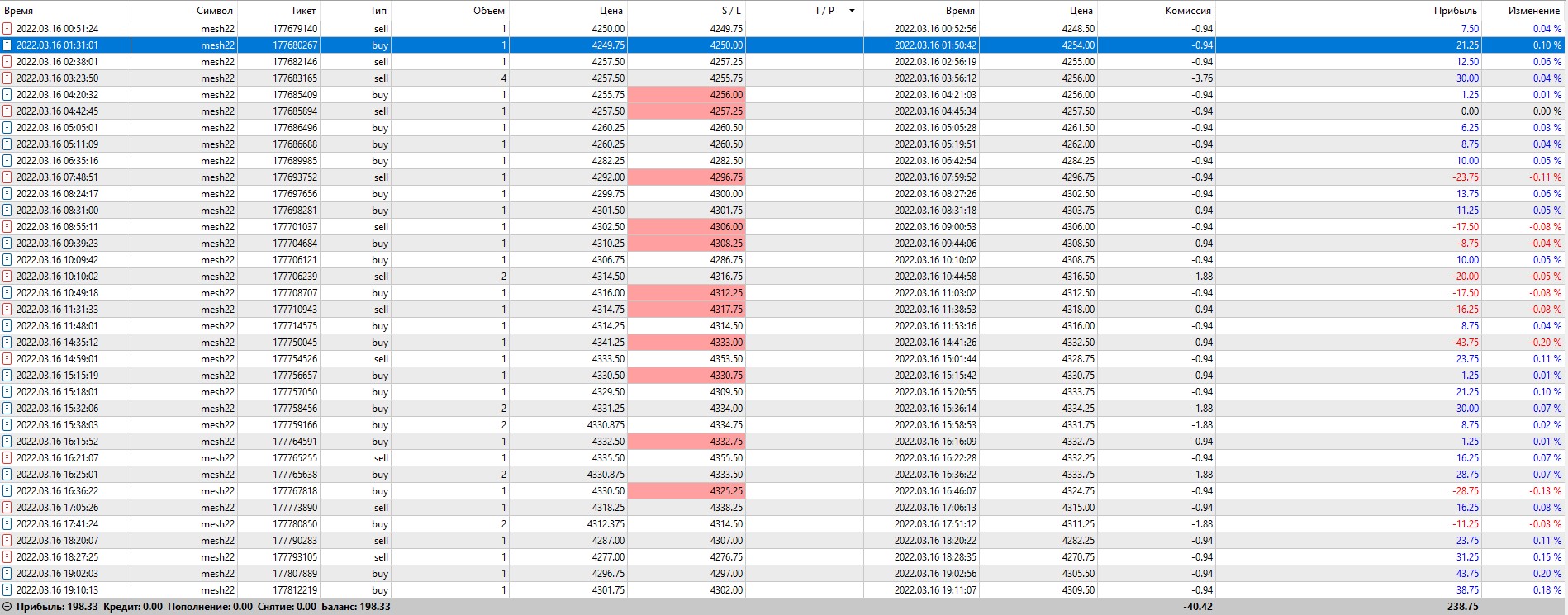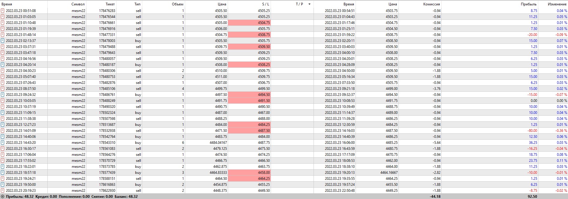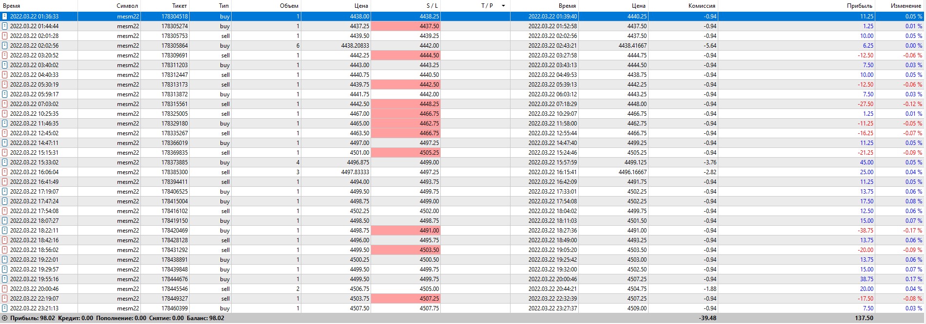 За 22.03.22. получился общий плюс 463,53$. СП500 получил плюс 98,02$. Наздак получил плюс 68,38$. Доу Джонс получил плюс 99,66$. Рассел получил минус -60,1$. Евро Стокс получил плюс 257,57$. Бот стоит на ВПН на демо счёте. Включены все кнопки. Торгует одновременно 1 контрактом на микро инструментах: СП500, Наздак, Доу Джонс, Рассел и мини Евро Стокс. Настройки стандартные с включёнными переносом стопа по цвету индикатора и безубытком (изменил с 3 на 2). Значение фильтра в трендах изменил с 5 на 3, начиная с американской сессии. Торгует с 00,30ч. до 13,00ч. и с 14,00ч. до 23,30ч. в пятницу до 20,30ч. Евро Стокс торгую с 01,00ч. до 13,00ч. и с 14,00ч. до 20,30ч. по времени терминала.