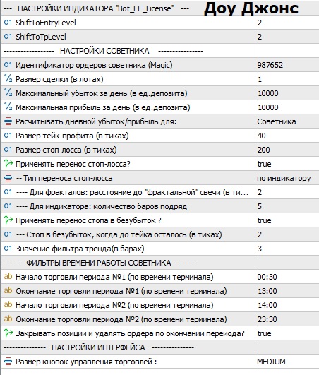 Я не знаю, как правильно. Стоп у меня переноситься по индикатору. И там я не менял параметры. Когда бот работал по фракталу, там были такие параметры, но это было раньше. Изменил значение фильтра в барах по совету Дмитрия, это значит, что для открытия сделки по кнопке 555 достаточно будет 3 баров на которых линия индикатора будет одного цвета. Размер стоп-лосса в тиках для Доу Джонса, Наздака и Рассела 200, для СП500 80, что соответствует 100$ для этих инструментов.