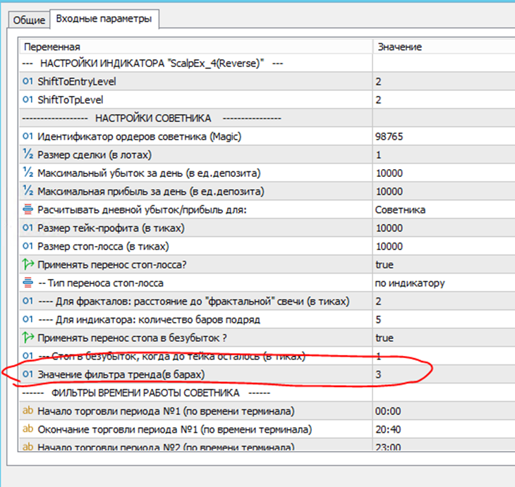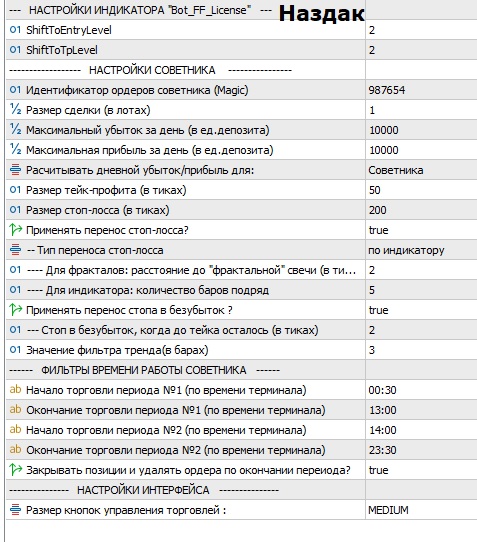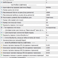 Здравствуйте, Рамиль! Изменил перенос стопа в безубыток с 3 на 2, везде кроме Евро Стокс. Депозит 10000$ на все пять инструментов, бот торгует одновременно на всех пяти, одним лотом. На Евро Стокс стоп в тиках стоит 25, а это по моим подсчётам 275$. Исходя из таких стопов, рассчитывайте депозит для Евро Стокс. Ещё надо не забывать менять время окончания торговли для всех инструментов кроме Евро Стокс в пятницу, ставить раньше на 3 часа, то есть вместо 23,30ч. 20,30ч. За 3 с лишним недели лучшие показатели пока у Доу Джонс плюс 627$. На втором месте Наздак плюс 335$. Остальные в минусе. Но недели были очень волатильные и торговать не рекомендовалось. Бот торгует на полном автомате с включённой кнопкой 555. Скрины настроек для Наздак, Евро Стокс, Доу Джонс (одинаковые с Рассел) и СП500 прилагаю.