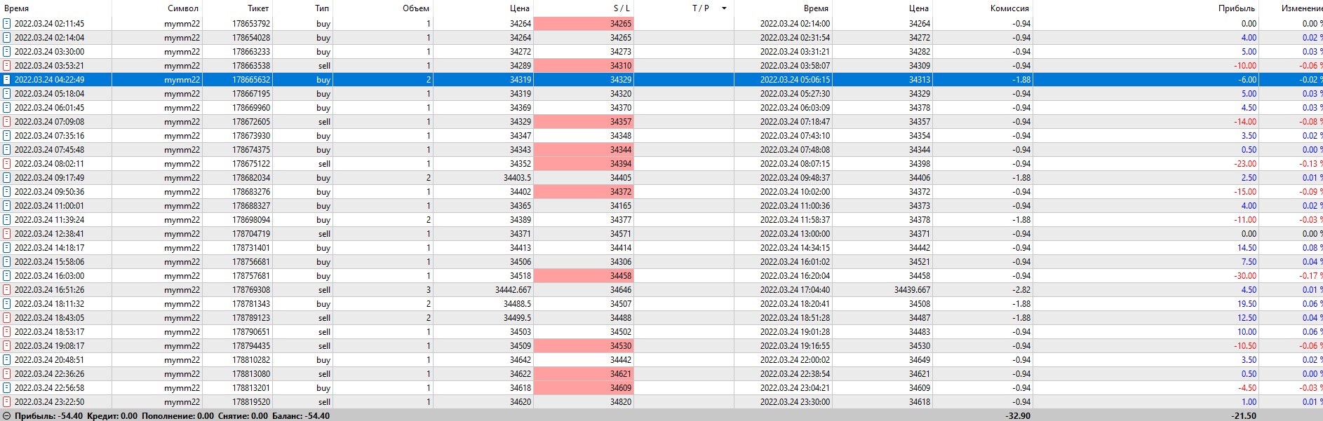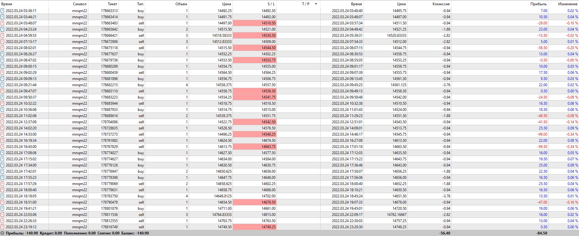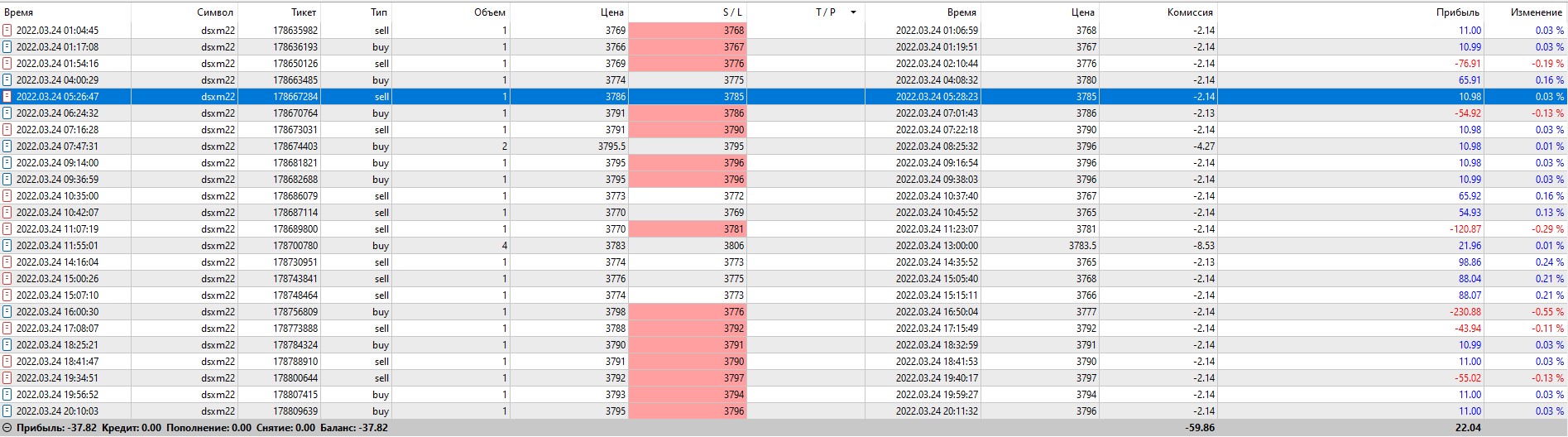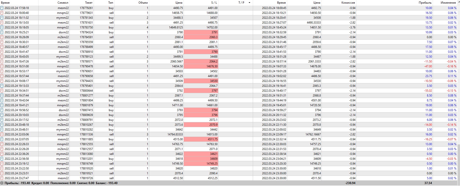 За 24.03.22. получился общий минус -193,4$. СП500 получил плюс 35,84$. Наздак получил минус -140,9$. Доу Джонс получил минус -54,4$. Рассел получил плюс 3,88$. Евро Стокс получил минус -37,82$. Бот стоит на ВПН на демо счёте. Включены все кнопки. Торгует одновременно 1 контрактом на микро инструментах: СП500, Наздак, Доу Джонс, Рассел и мини Евро Стокс. Актуальные настройки почти стандартные, выложены на скринах выше в этой ветке. По пятницам меняю окончание торговли до 20,30ч. по времени терминала на всех инструментах кроме Евро Стокс.
