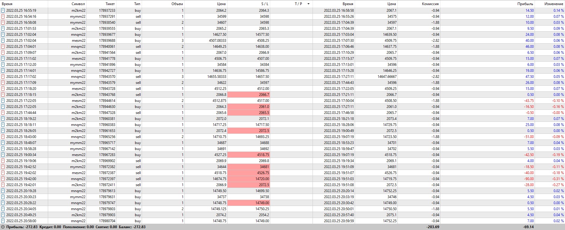 За 25.03.22. получился общий минус -272,83$. СП500 получил плюс 13,35$. Наздак получил минус -227,94$. Доу Джонс получил минус -1,88$. Рассел получил минус -20,1$. Евро Стокс получил минус -36,26$. За неделю получился общий плюс 475,8$. СП500 получил плюс 99,2$, Наздак получил минус -137,92$, Доу Джонс получил плюс 108,54$, Рассел получил минус -56,46$, Евро Стокс получил плюс 462,44$. За четыре недели тестирования на полном автомате в плюсе Доу Джонс 571,64$ и СП500 35,02$. Остальные инструменты в минусе. Бот стоит на ВПН на демо счёте. Включены все кнопки. Торгует одновременно 1 контрактом на микро инструментах: СП500, Наздак, Доу Джонс, Рассел и мини Евро Стокс. Актуальные настройки почти стандартные, выложены на скринах выше в этой ветке. По пятницам меняю окончание торговли до 20,30ч. по времени терминала на всех инструментах кроме Евро Стокс. Бот торговал на М1, дальше будет торговать на М5.