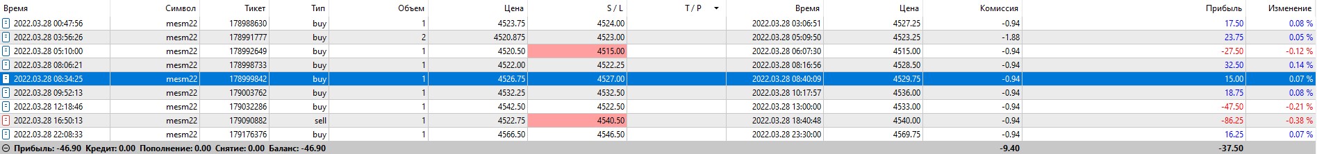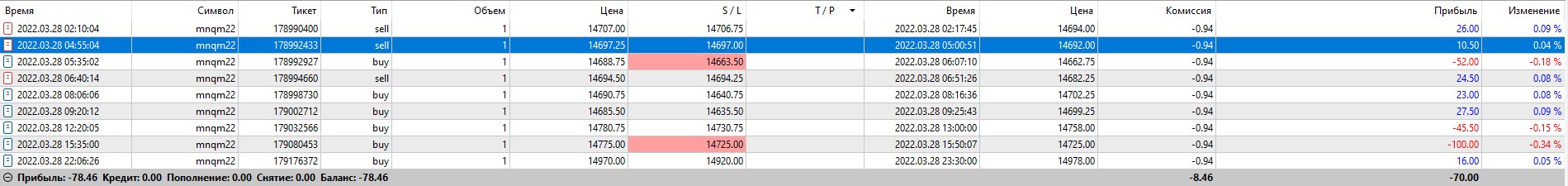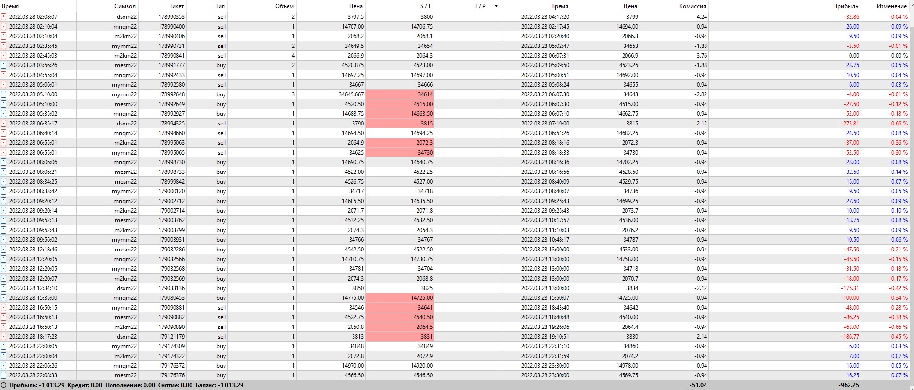 За 28.03.22. получился общий минус -1013,29$. СП500 получил минус -46,9$. Наздак получил минус -78,46$. Доу Джонс получил минус -111,22$. Рассел получил минус -97,34$. Евро Стокс получил минус -679,37$. Бот стоит на ВПН на демо счёте, брокер АМП Глобал. Включены все кнопки. Торгует одновременно 1 контрактом, таймфрейм М5, на микро инструментах: СП500, Наздак, Доу Джонс, Рассел и мини Евро Стокс. Актуальные настройки почти стандартные, выложены на скринах выше в этой ветке. По пятницам меняю окончание торговли до 20,30ч. по времени терминала на всех инструментах кроме Евро Стокс.