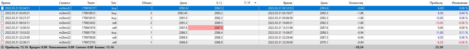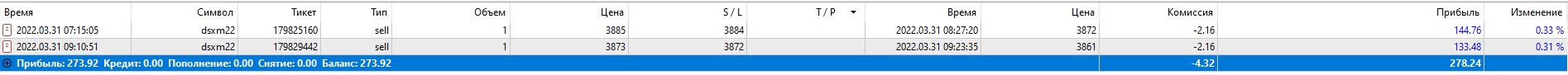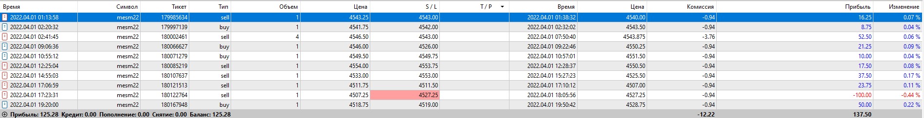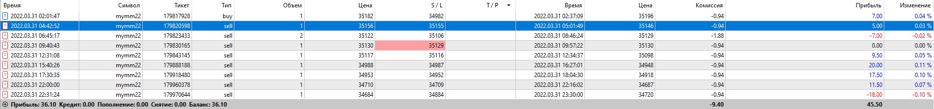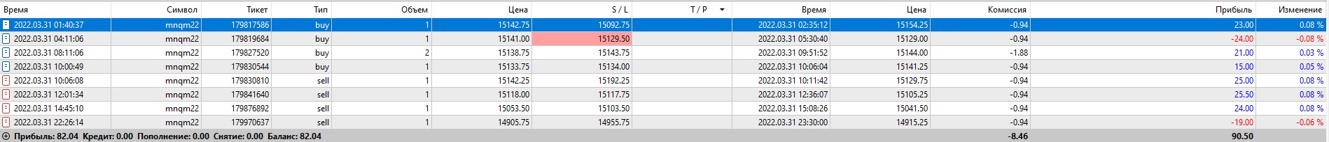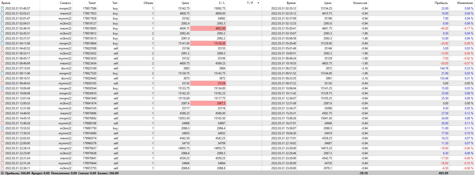 За 30.03.22. получился общий минус -128,14$. СП500 получил плюс 17,47$. Наздак получил минус -30,66$. Доу Джонс получил минус -16,72$. Рассел получил плюс 37,04$. Евро Стокс получил минус -135,27$. Бот стоит на ВПН на демо счёте, брокер АМП Глобал. Включены все кнопки. Торгует одновременно 1 контрактом, таймфрейм М5, на микро инструментах: СП500, Наздак, Доу Джонс, Рассел и мини Евро Стокс. Актуальные настройки почти стандартные, выложены на скринах выше в этой ветке. По пятницам меняю окончание торговли до 20,30ч. по времени терминала на всех инструментах кроме Евро Стокс.