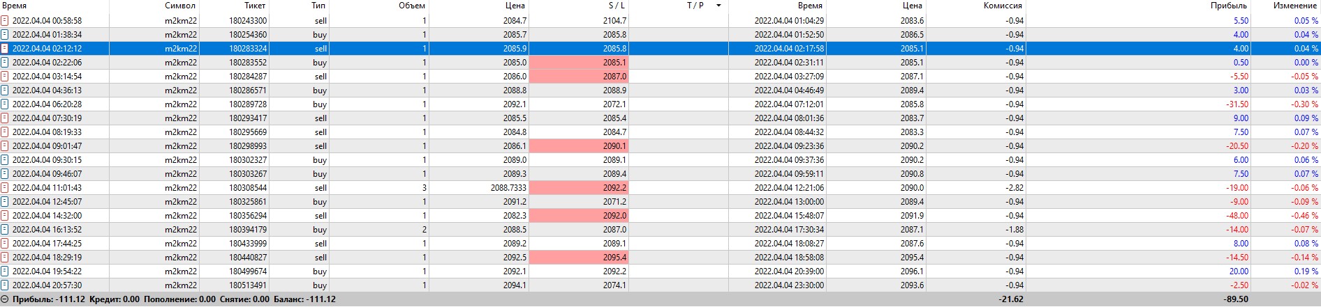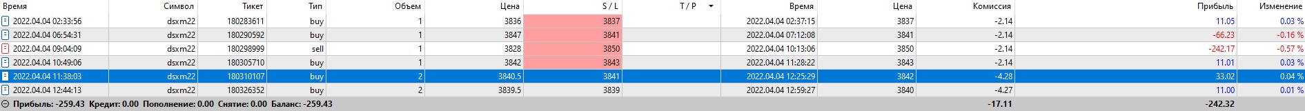 За 04.04.22. получился общий минус -147,87$. СП500 получил минус -46,94$. Наздак получил плюс 342,24$. Доу Джонс получил минус -72,62$. Рассел получил минус -111,12$. Евро Стокс получил минус -259,43$. Бот стоит на ВПН на демо счёте, брокер АМП Глобал. Включены все кнопки. Торгует одновременно 1 контрактом, таймфрейм М3, на микро инструментах: СП500, Наздак, Доу Джонс, Рассел и мини Евро Стокс. Актуальные настройки почти стандартные, выложены на скринах выше в этой ветке. По пятницам окончание торговли в 19,30ч. по времени терминала.