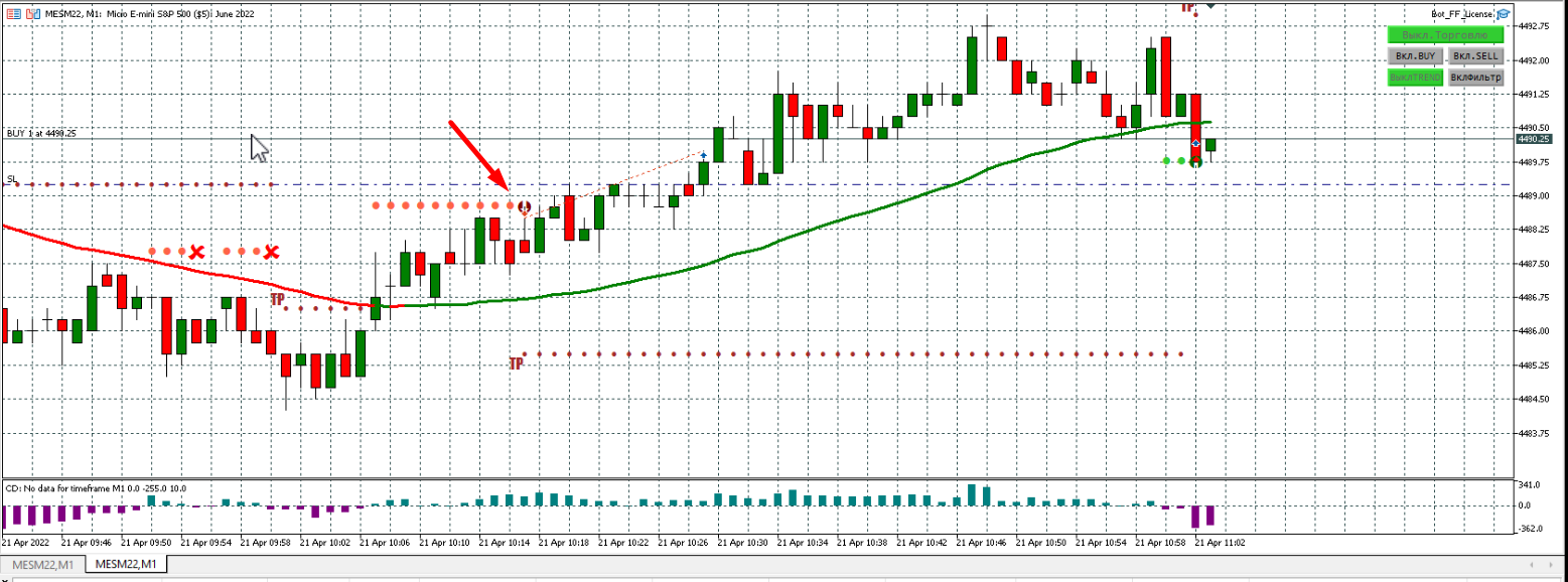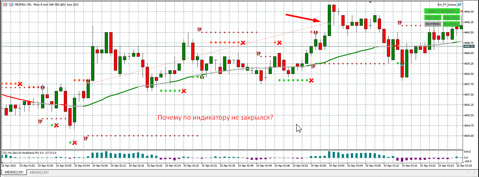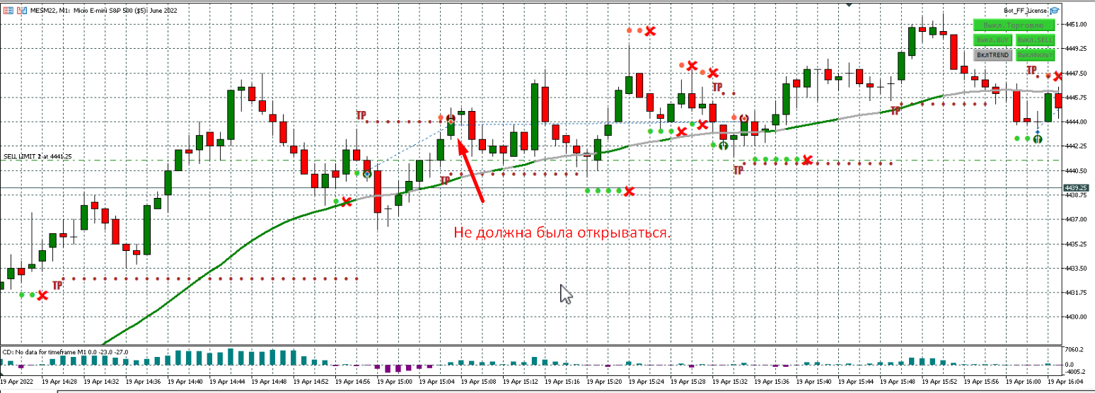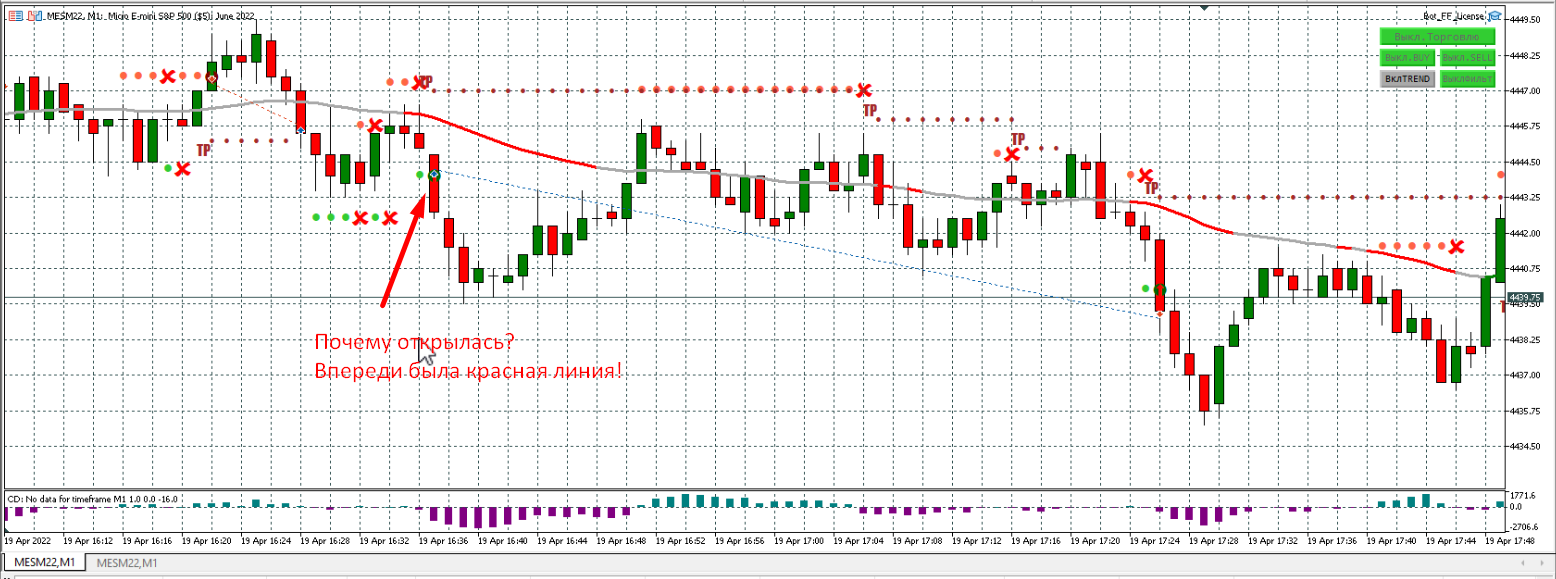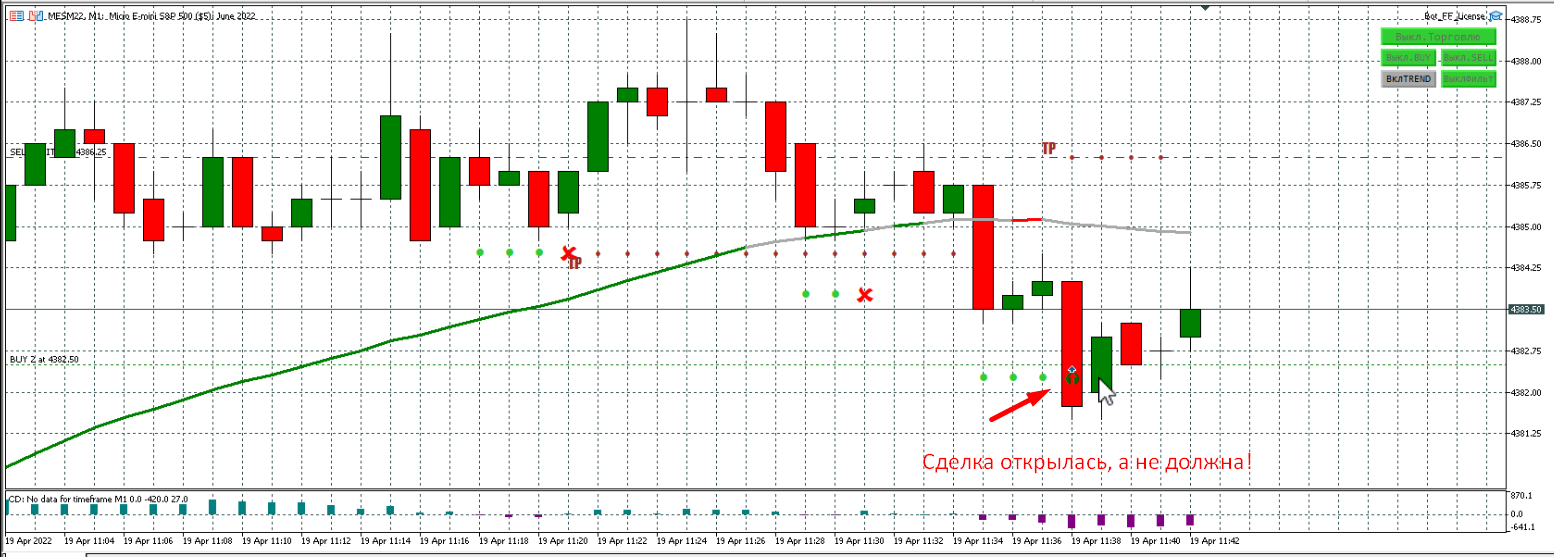 Сделка открылась, а не должна, в настройках указано "Значение фильтра тренда (в барах) - 3". Как видите, была красная линия. В Трендовом тоже открылась эта сделка - то же не понятно, почему.