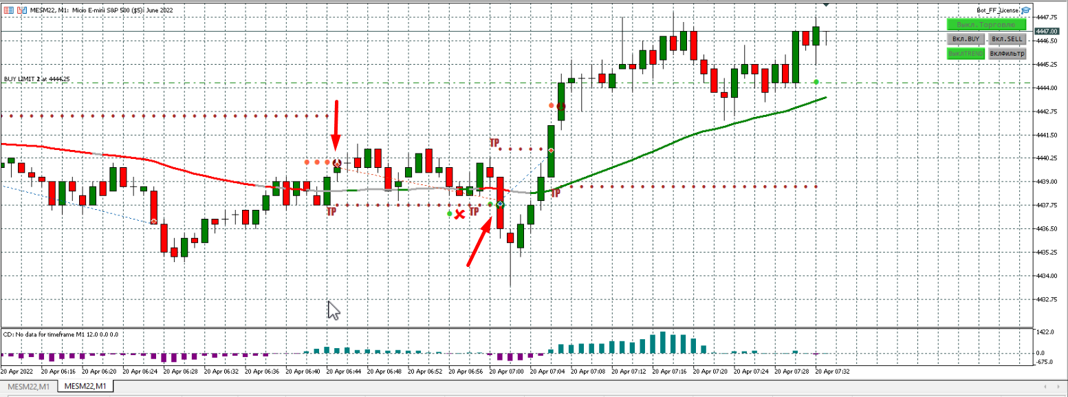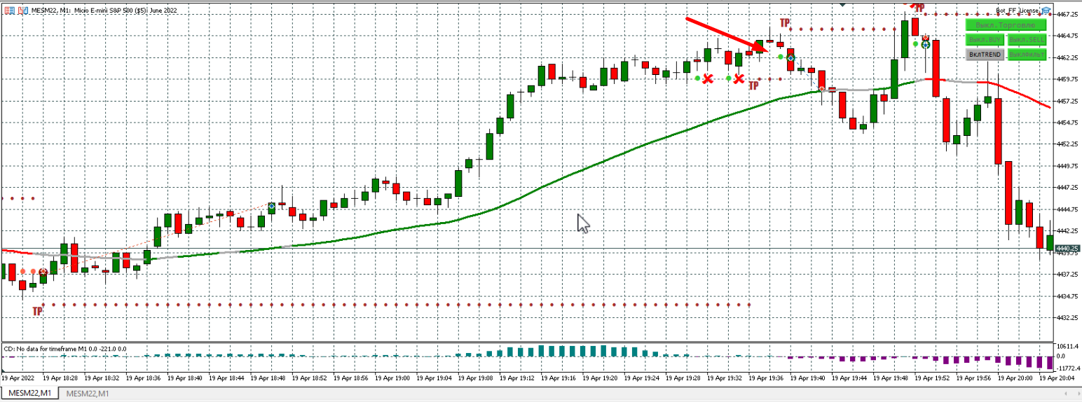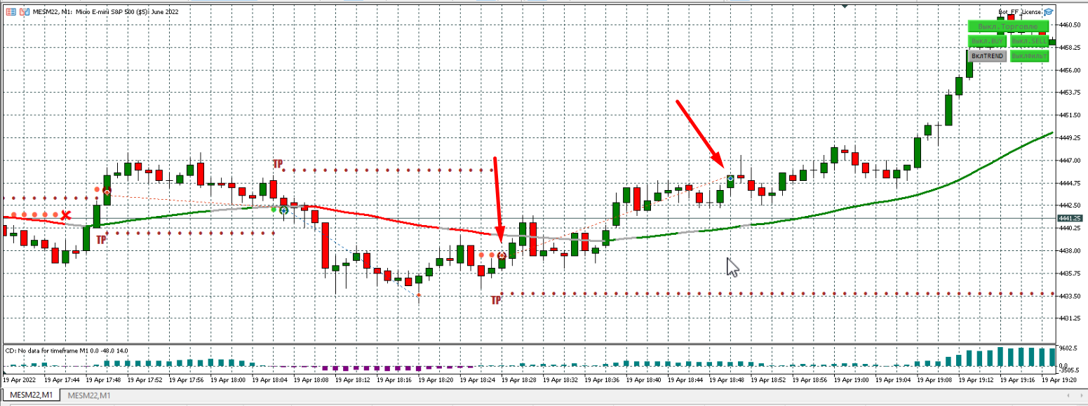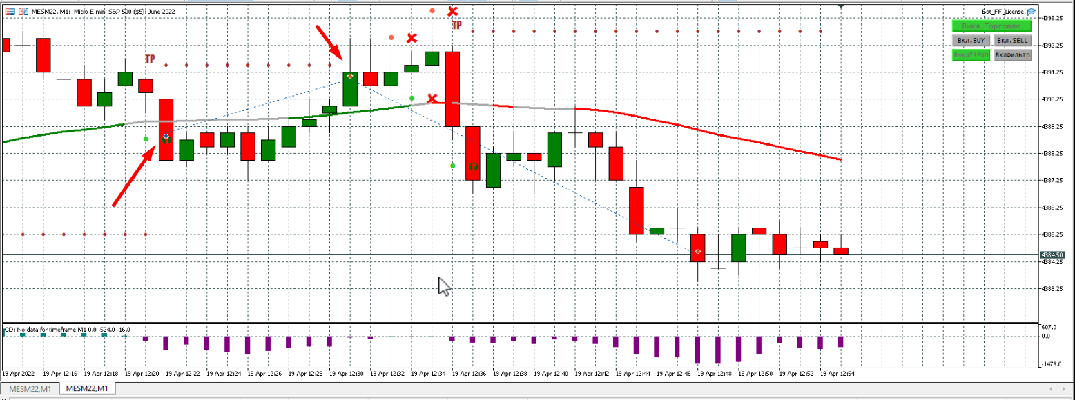 Серую я добавил, т.к. вообще было тяжко смотреть на минусы. Серая линия хорошо себя отрабатывала на предыдущей версии бота. По результатам стало лучше, но все равно минусов больше, чем плюсов. Тренд вообще не работает у меня.