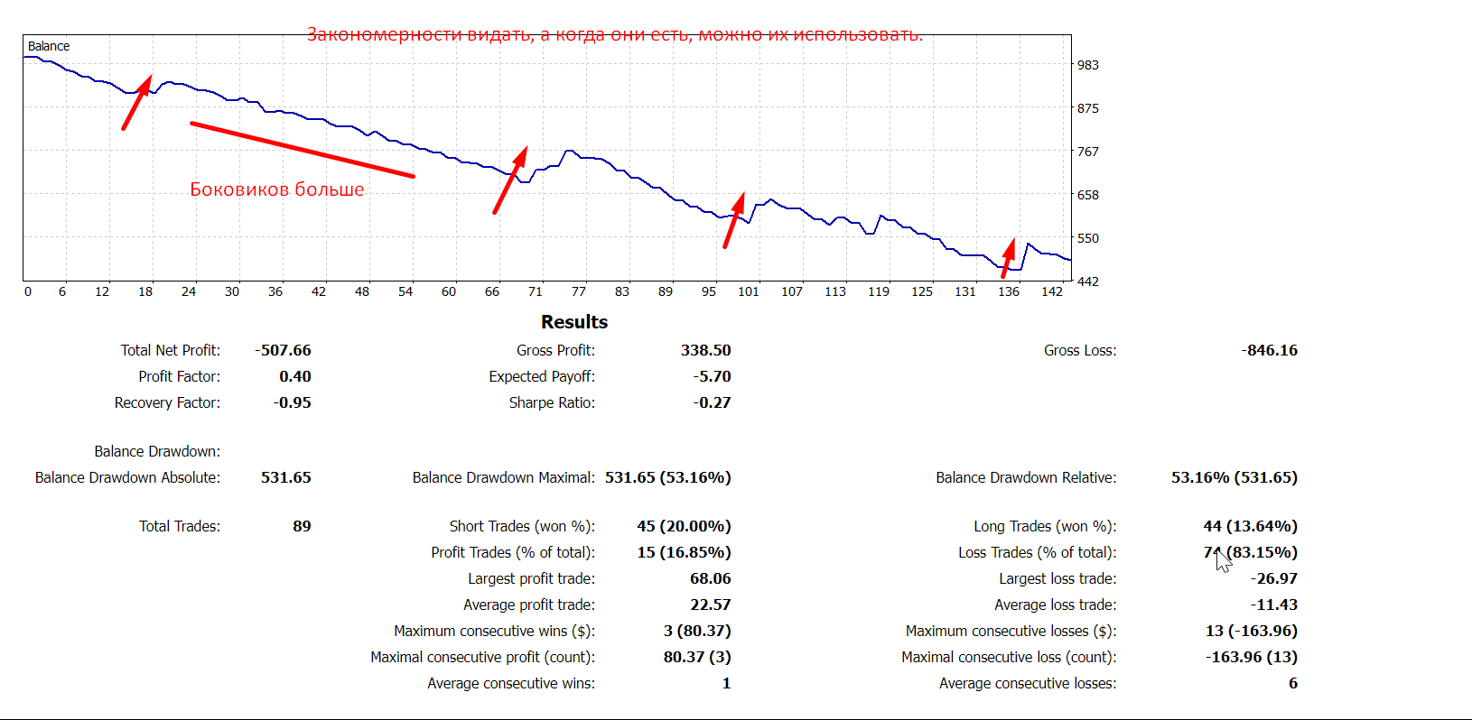 • Более менее хорошая статистика была, когда мы зарабатывали на боковиках, а теряли на трендах. Хорошо было бы оставить этот вектор и переоформить в стратегию, тем более что на трендах потери значительно сократились алгоритмами бота. Не знаю, куда это все делось.