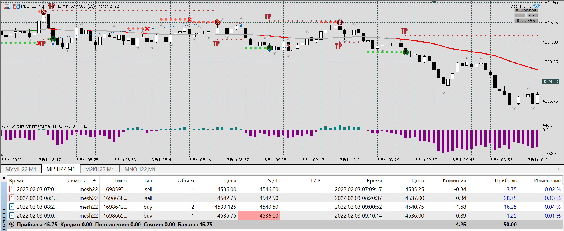 Попробуйте без включения 555 торговать. И историю сделок за этот день выложите.