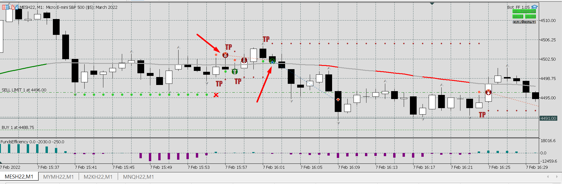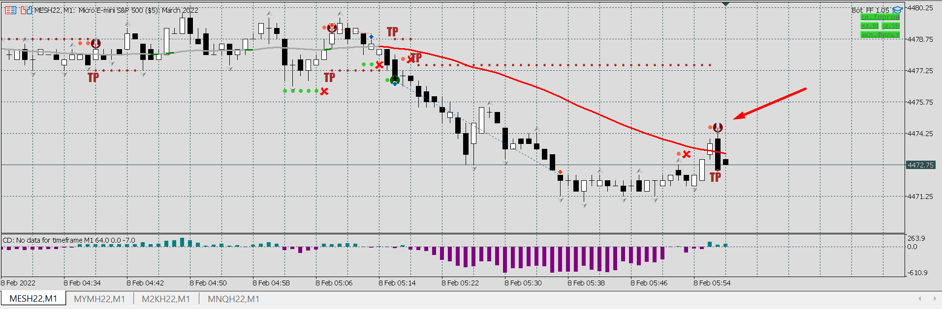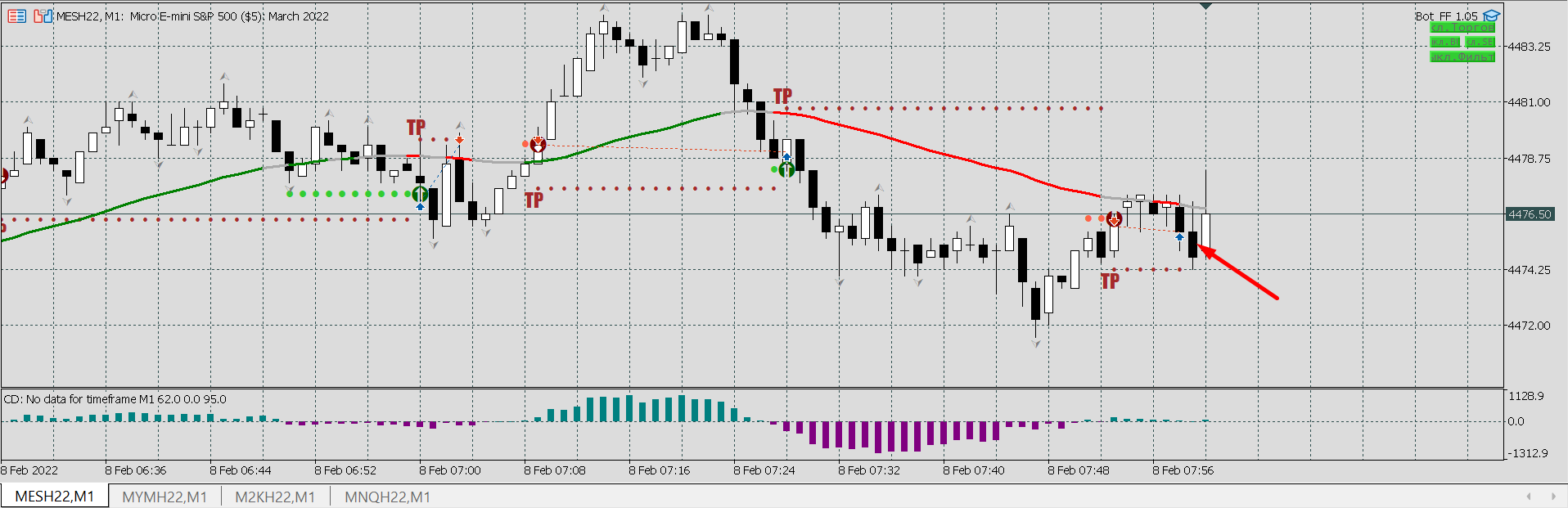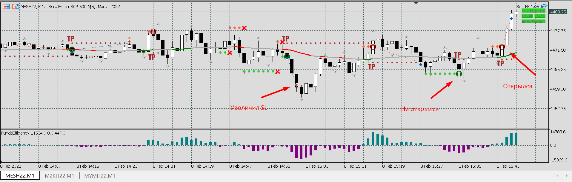 Объясните, пожалуйста, почему сделка закрылась здесь? Да и открываться следующей не следовало бы, но понятно - в момент открытия были серые линии.