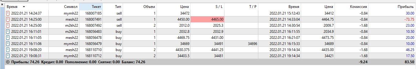 Отчет за 21.01 Одна сделка была по моей ошибки. Не учел открытие Америки, получил стоп. Все таки торговля на работе не дает того сосредоточения, какого достигаешь дома в спокойной тихой обстановке. Зато уже почти к 00:00 по Тюменскому времени придя домой выполнил план.