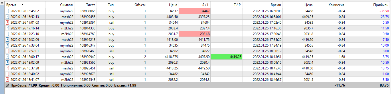 Отчет за 26.01. Пришел домой в районе 22 вечера. Думал не успею, в голове как то все суета, вот словил минус самый первый и попал на антиминитренд, фрактальный стоп был слишком далеко, решил пересидеть, но это моя ошибка, а все из-за того что тороплюсь. Торговля получилась смесь агрессивной с 555.