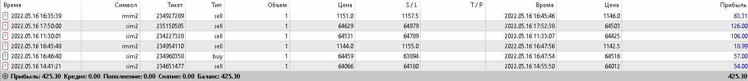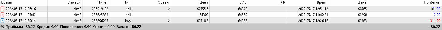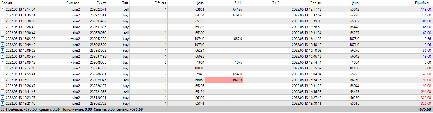 13 мая брокер Финам, второй день работы, полуавтомат итого: - 675
