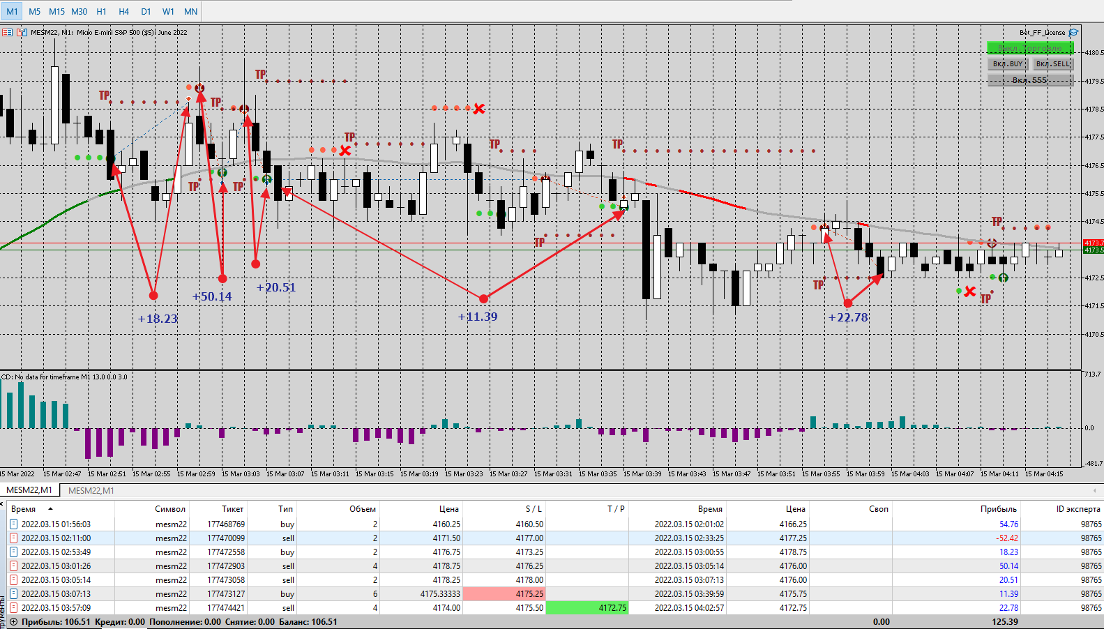 Отчёт за 15.03.2022. Общая прибыль с вычетом комиссии 106,51. Всего 7 сделок( +6/-1). Все открыты и закрыты ботом. На сегодня терминал закрываю.