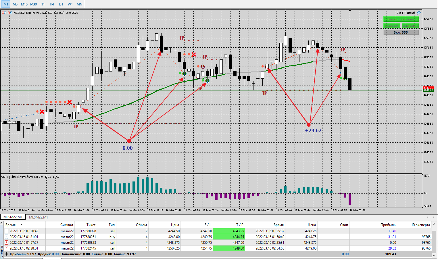 Отчёт за торговлю 16.03.2022. Азия, 4 сделки. прибыль +93,97 без комиссии. 8% от депозита.