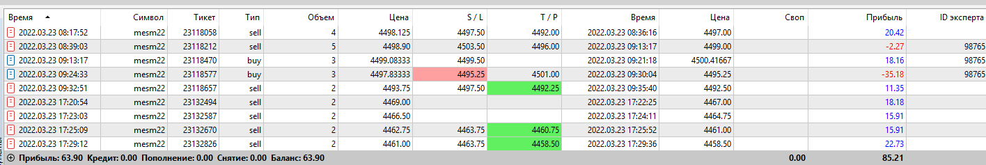 Отчёт по торговле за 23.03.2022 Профит 85,21, что составляет 12,7% от депозита. Последние сделки открыты вручную. На сегодня достаточно. Терминал закрываю.
