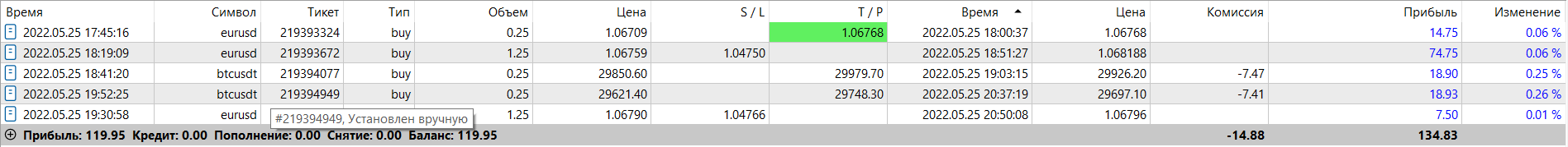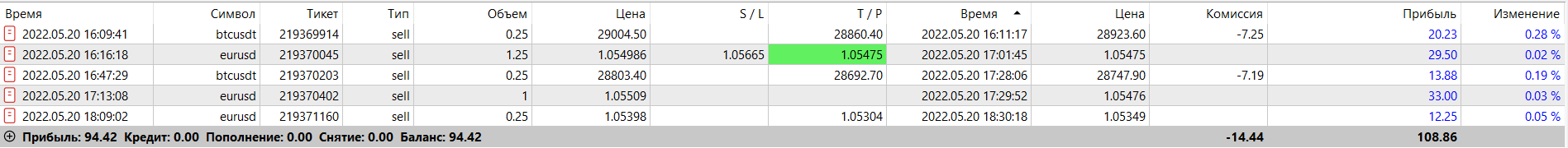 Торговля "М5" - "EURUSD" и "BTCUSDT"