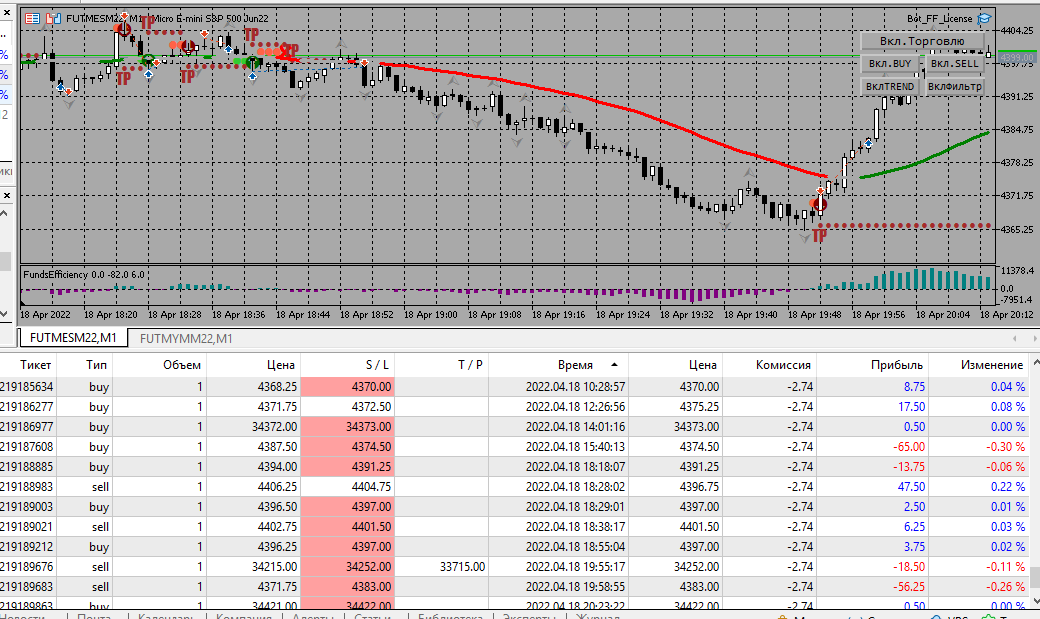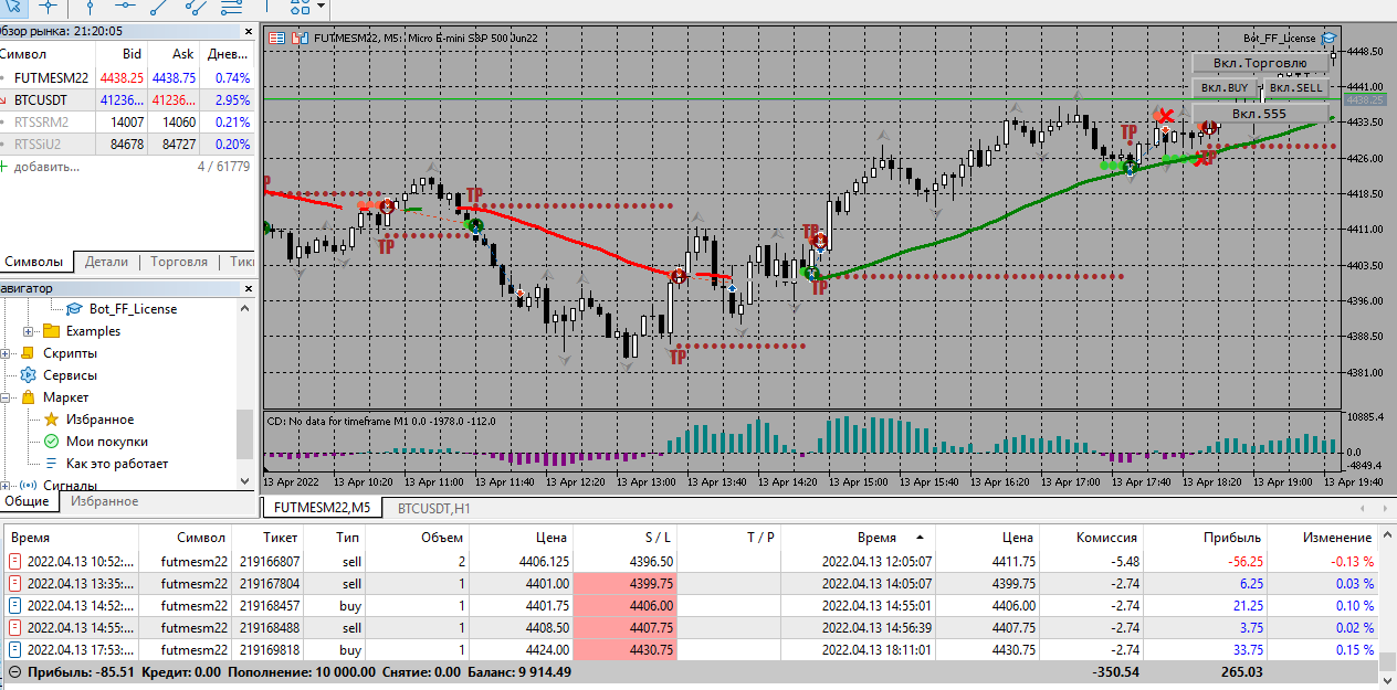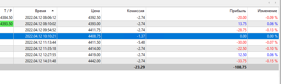 08.04.22 решил перейти на таймфрейм М5. Хотя торговлю удалось провести только вечером, но результат немного удивил. Не всегда получалось следить за трендом, сделок было не много, но статистика такова: из пяти сделок одна отрицательная и четыре положительных!