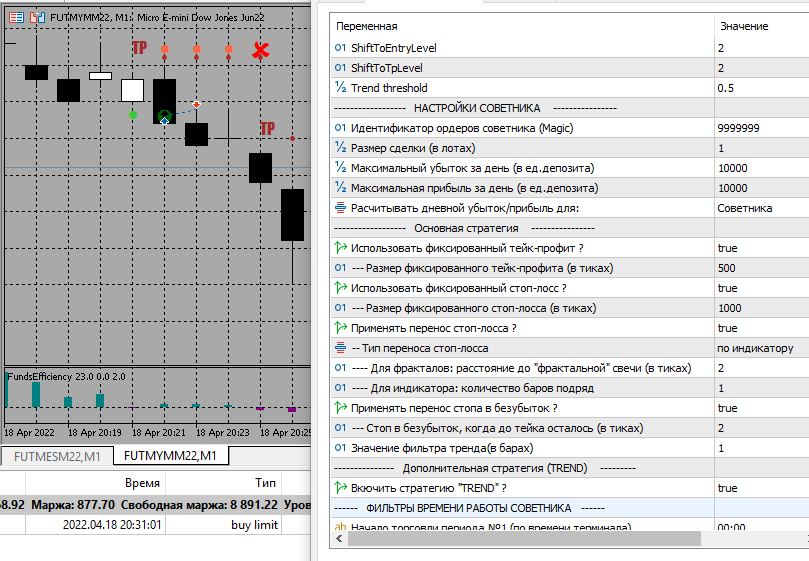 Добрый вечер. Вначале полдня бот работал на М5 плюс подключил Доуджонс (пока с настройками не разобрался на этом индексе).