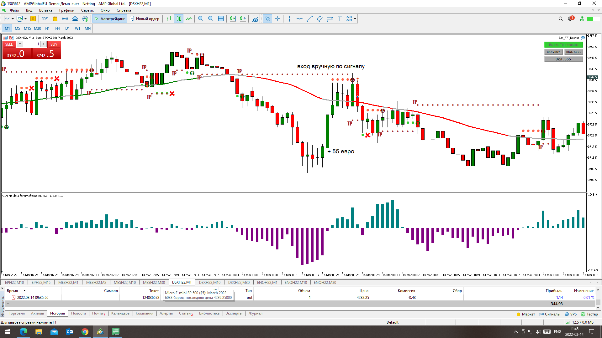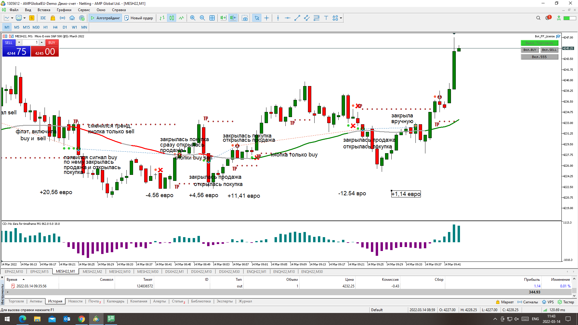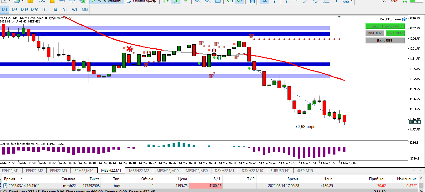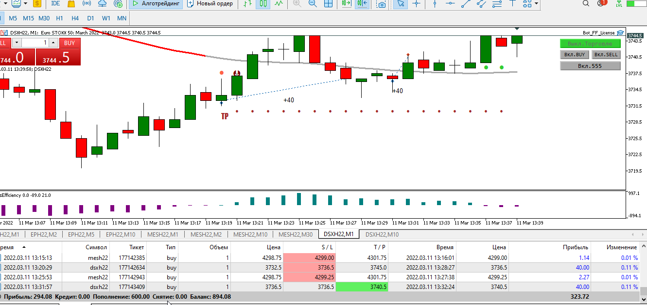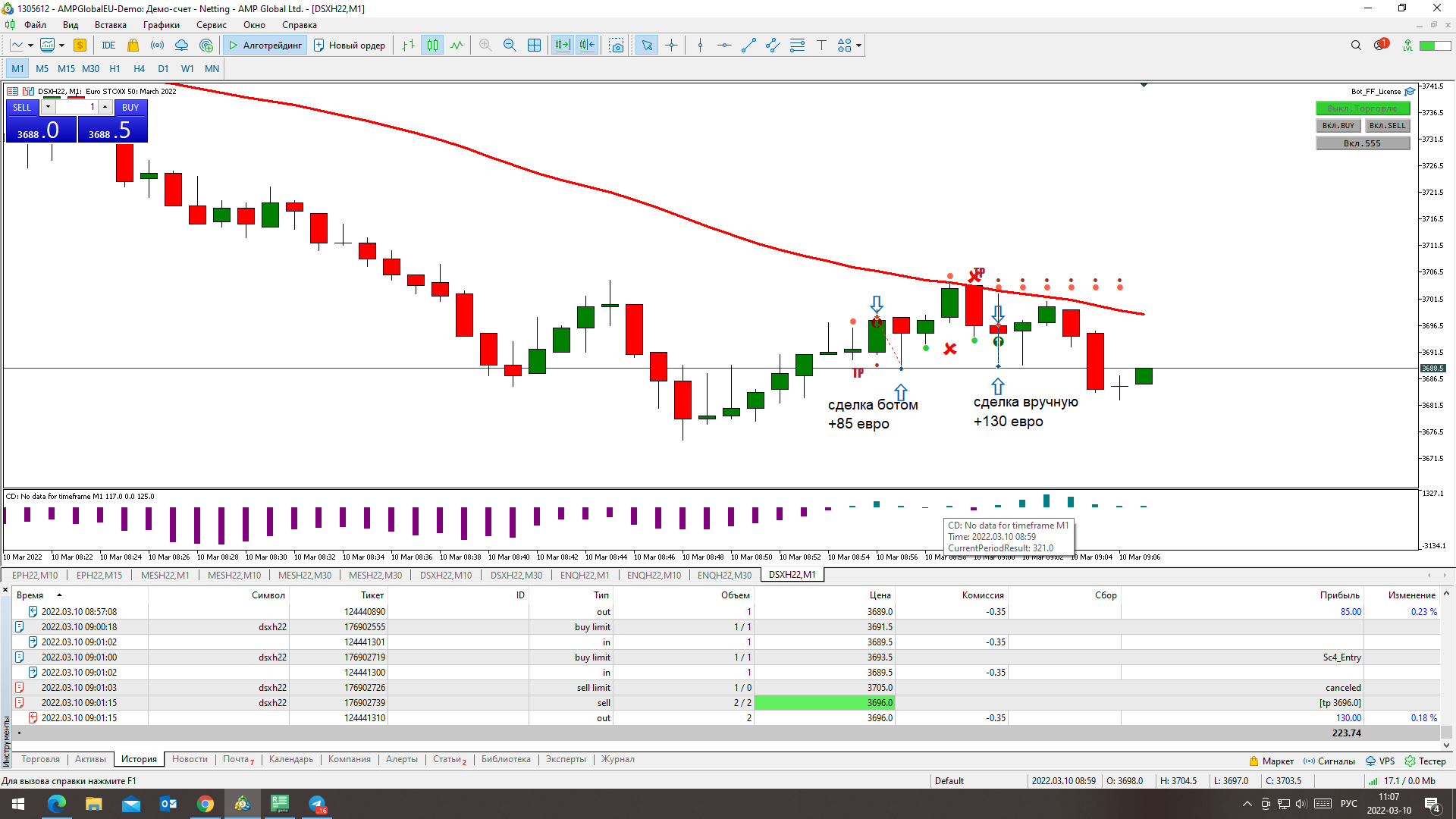 Сегодня решила торговать только ботом. Приняла во внимание рекомендации Дмитрия в ветке Татьяны. Результат по MESH +3.43 евро. Работы много, результата мало :))