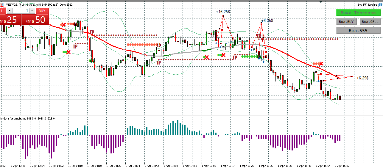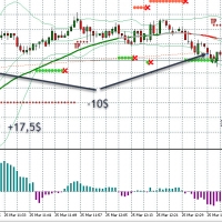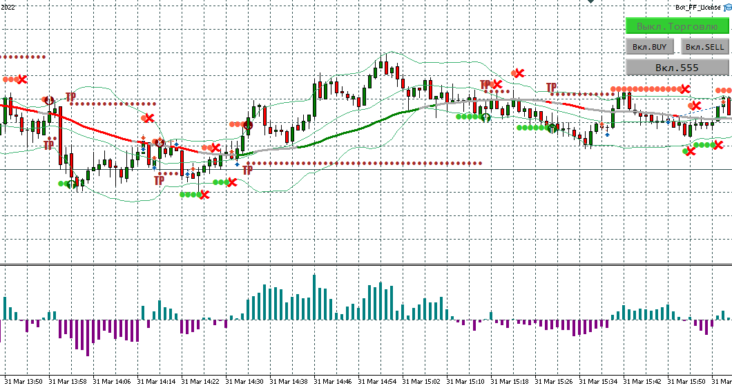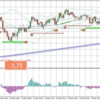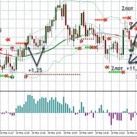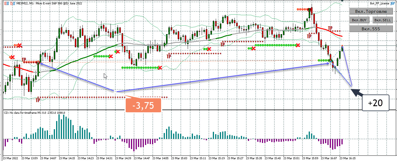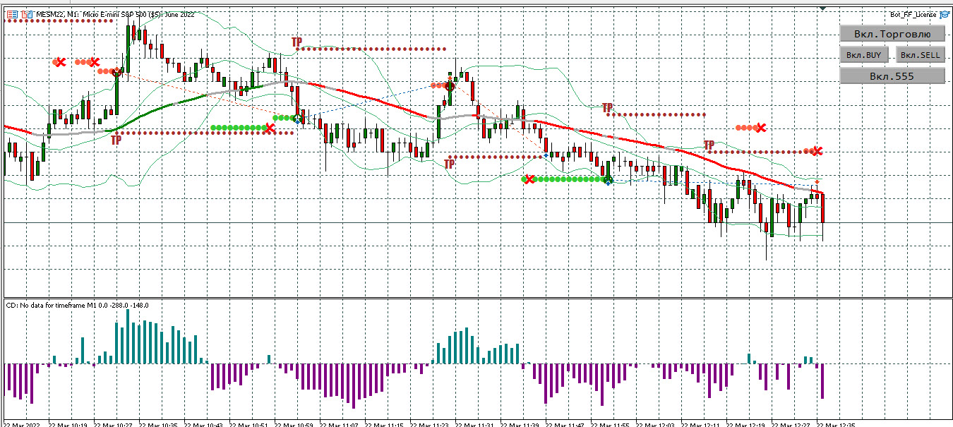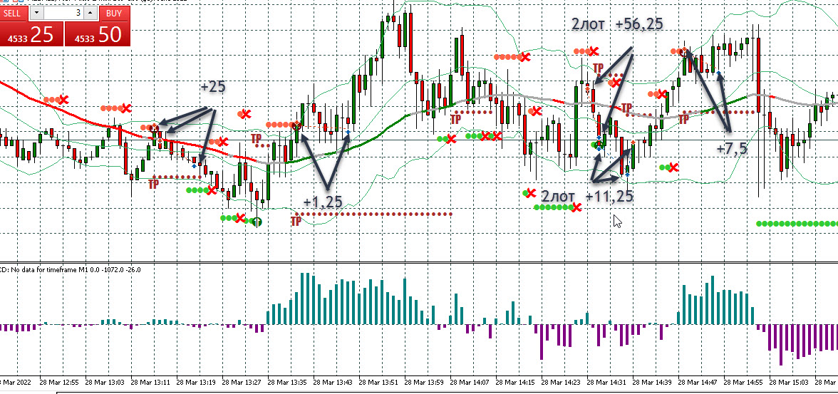 30.03.2022 AMP DEMO Первая сделка на Европе, вторая на Америке. Отступ сигнала свечи 10. Первую сделку закрыл т.к. цена не двигалась в нужном направлении. Вторую сделку открыл в надежде что цена от верхней линии Болинджера опустится до указанного роботом тейк-профита, но цена потоптавшись пошла по зеленому тренду против сделки. Пришлось сделать дополнительные входы и в нужный момент закрыть сделку. Итого +100$ при плане 25$.