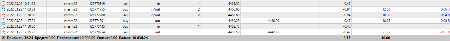 25.03.2022 ДЕМО Торговал на Европе (первый снимок), затем на Америке, где словил длинный (-). После чего начал помогать роботу, торгуя вручную. Но последнюю сделку мы сделали вместе: 1 лот-робот, 5лот- я. После последней сделки вышел в (+). Итого: +73.75$.