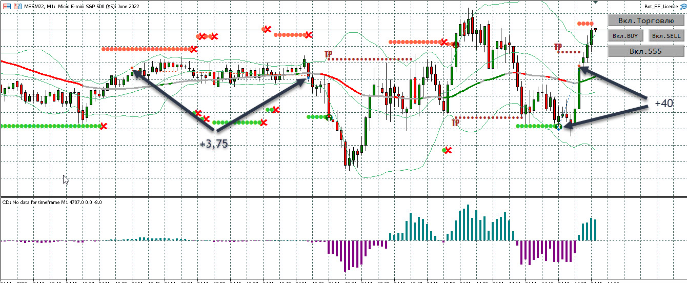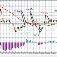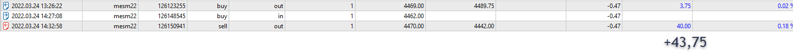 24.03.2022 ДЕМО АМР Первая сделка в конце европейской сессии, закрыл вручную т.к через минуту начиналась Американская сессия и не хотелось попасть под негативную раздачу. На этой сделке отступ сигнала свечи стоял 10. Вторая сделка во время Американской сессии, отступ сигнала свечи 20. При плане +25$, наторговал +43,75$. План перевыполнил.