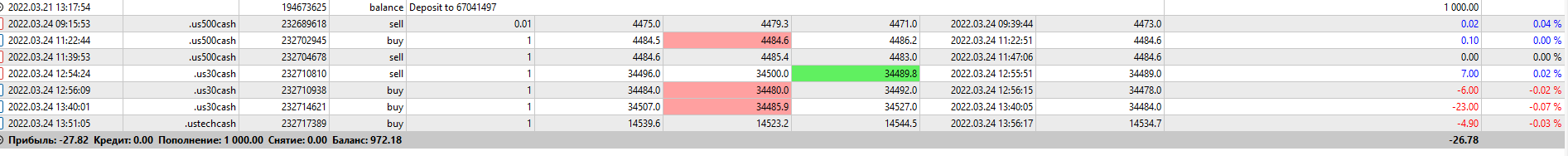 Первый день торговли на демо, результат:  -23$, Торговал на SP500, USTech (Nasdaq) и Us30 (Dow).