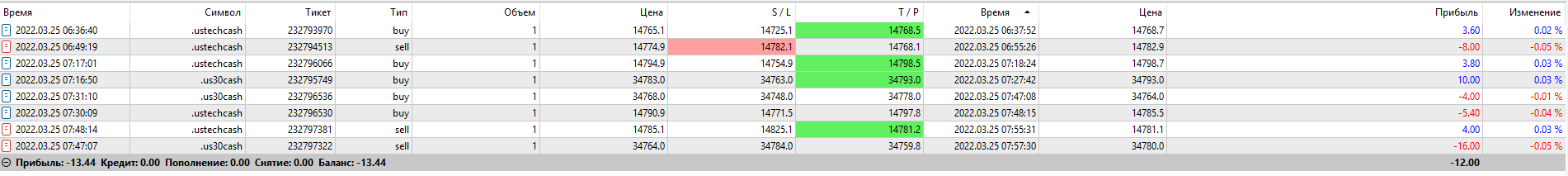 Второй день торговли на демо с депозитом 1000$. Результат: опять минусовой - 13.44$. Торговля на полуавтомате.