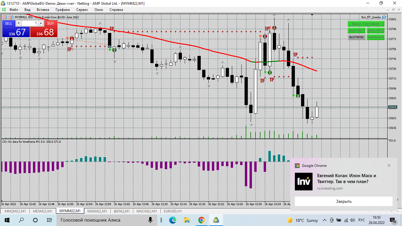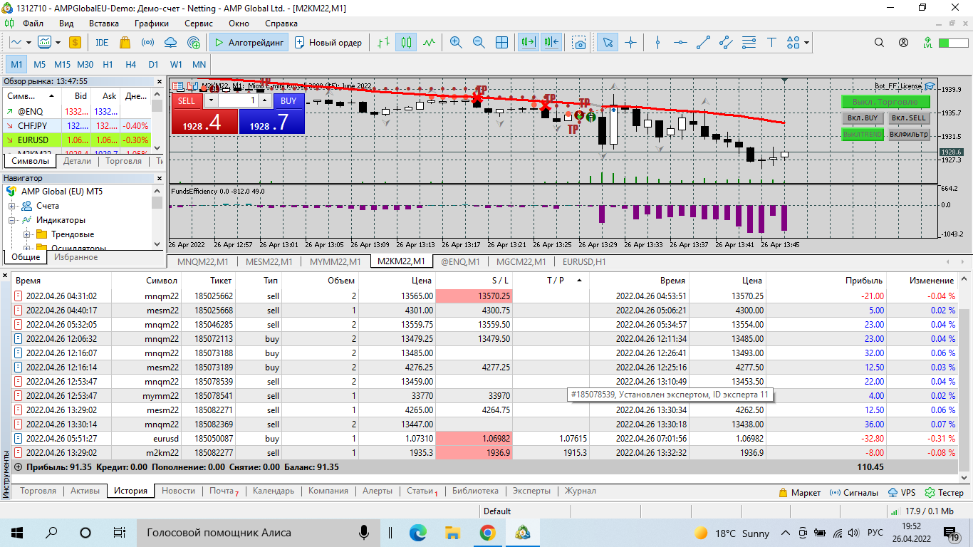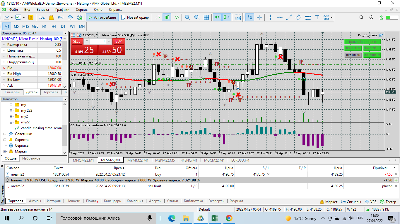 Приветствую, поработал с настройками, пересмотрел еще раз трансляцию, работаю на АМР, так как депозит почти слил, на демо. торговал час с небольшим, установил на четыре инструмента разные настройки, на MNQ. MES. MYM в боковике с фильтром, на M2K по тренду, вот результаты