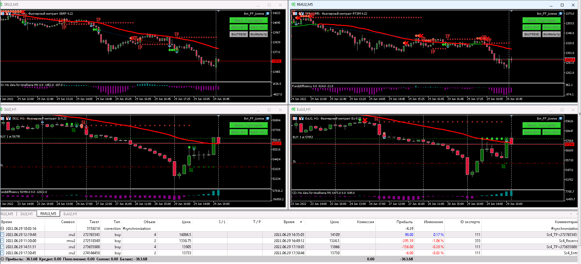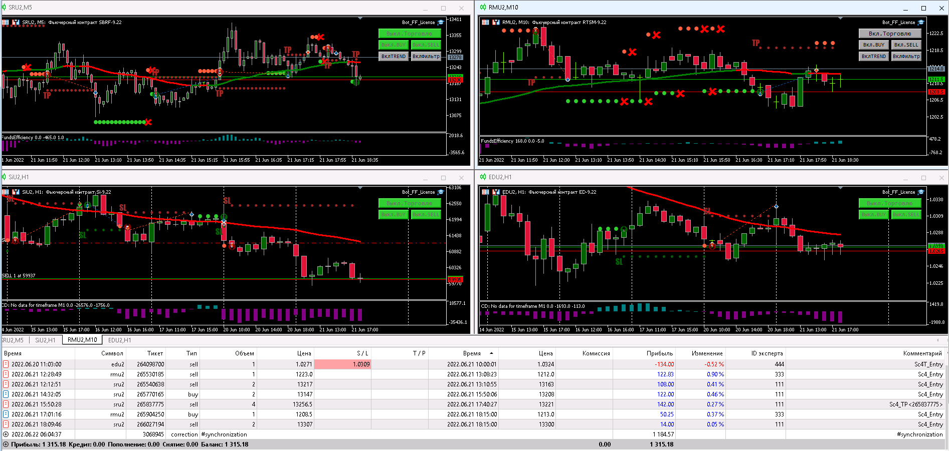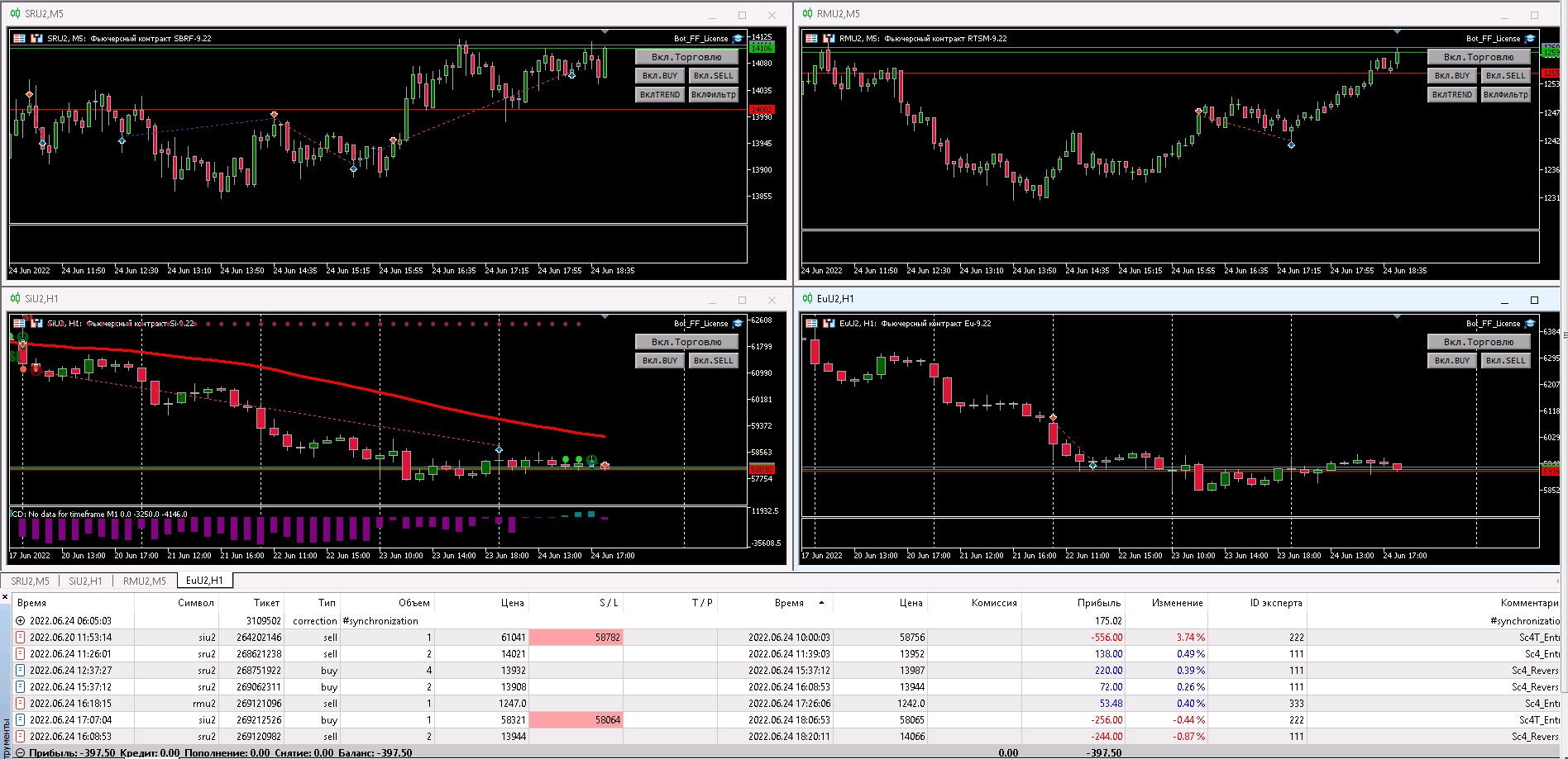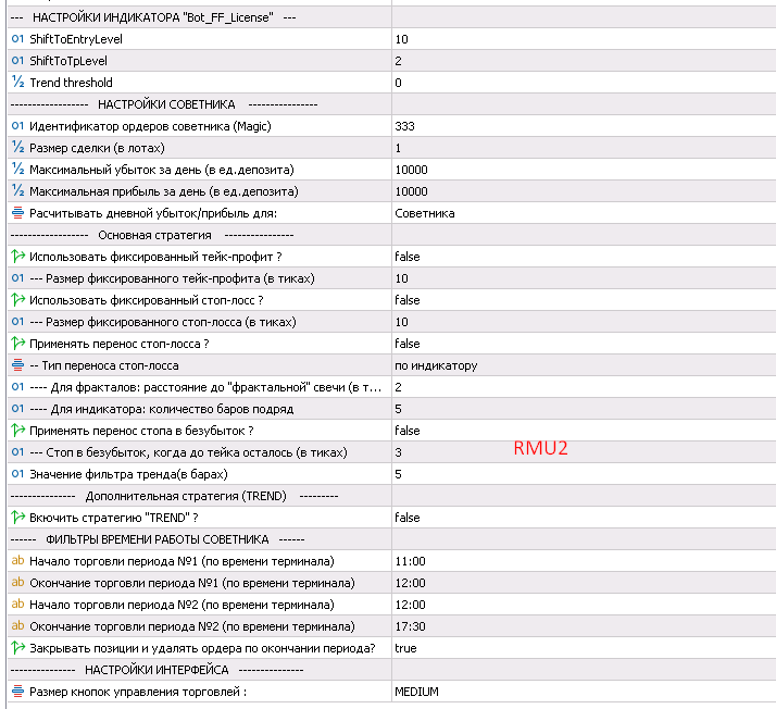 Антон, здрвствуй!  Ты пишешь, что переносишь все сделки на другие сутки, то есть вроде как на EuU2 -круглосуточная торговля, а в настройках на RMU2 стоит true (да) "закрывать позиции и удалять ордера по окончании позиции? "  Как правильно оставлять на круглосуточную торговлю ?