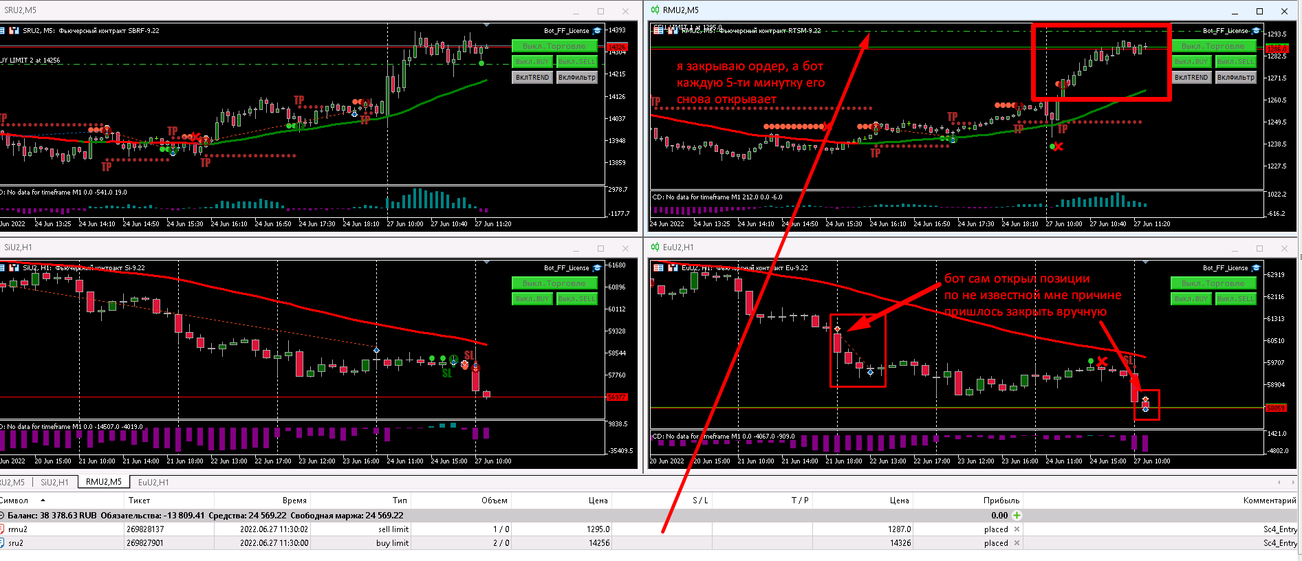 Дмитрий, у меня бот сегодня как-то странно начал работать - открывает сам сделки. Такое наблюдалось и ранее, но сегодня снова и на двух инструментах. Как будто он обращается к прошлому старому сигналу, который уже сработал, но в настройках времени бота сделки были в этот период не разрешены. Дополнительные комментарии на скрине: