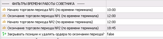 Под круглосуточной торговлей (у меня это SiU2 и EuU2) имеется в виду, что бот торгует в течении всего времени торговой сессии на Мосбирже (это с 10:00 до 18:45) и если будет открыта какая-то сделка к концу сессии, то она не закрывается и переходит открытой на следующий день. Вот настройки по времени: